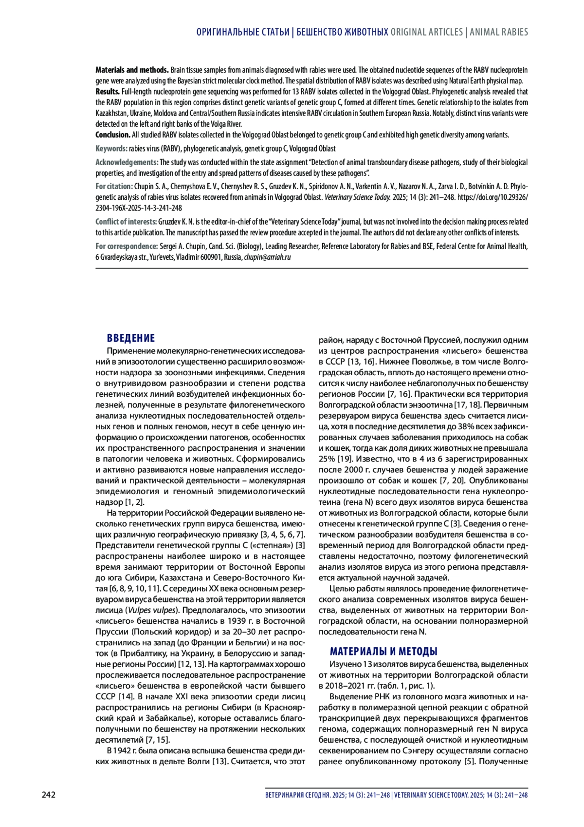 Введение. Нижнее Поволжье, в том числе Волгоградская область, вплоть до настоящего времени относится к числу наиболее неблагополучных по бешенству регионов России. Сведения о генетическом разнообразии возбудителя бешенства в современный период для Волгоградской области представлены недостаточно, поэтому филогенетический анализ изолятов вируса бешенства из этого региона представляется актуальной научной задачей.