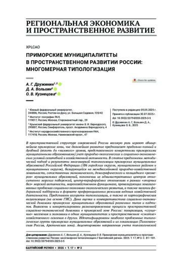 7.Дружинин, А. Г., Лялина, А. В. 2020, Приморские муниципалитеты России: концептуализация, идентификация, типологизация, Геополитика и экогеодинамика регионов, т. 6, № 2, с. 20—35, EDN: LPVNCG