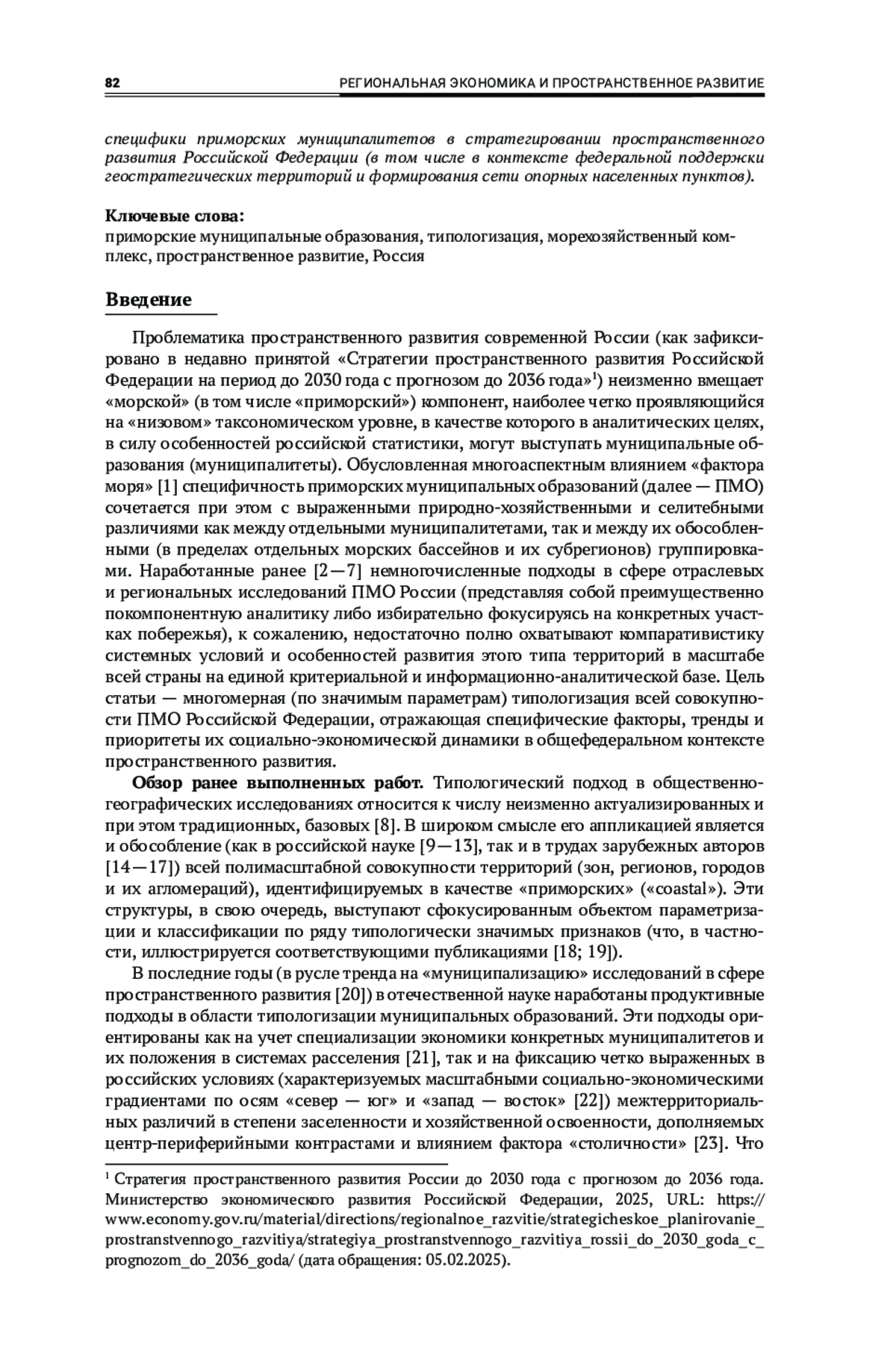 В пространственной структуре современной России весомую роль играют обширнейшие приморские зоны, чье дальнейшее развитие предполагает предельно полный и дробный (вплоть до «низового» уровня, представленного конкретными приморскими муниципальными образованиями) учет природно-экологических и социально-экономических условий селитебной и хозяйственной активности. В статье предложены методический подход и результаты многомерной типологизации приморских муниципальных образований Российской Федерации (186 городских округов, муниципальных районов и муниципальных округов), базирующейся на межбассейновой природно-хозяйственной зональности, сопоставлении экономического, демографического и площадного «размеров» муниципальных образований, положении их административных центров относительно морских побережий, центр-периферийных отношениях в рамках «опорных баз» морской активности, морехозяйственном функционале, превалирующих локализованных проблемах социально-экономико-экологического развития, а также наличии федеральной поддержки в формате преференциальных режимов ведения хозяйственной деятельности. Представлен алгоритм типологизации, а также ее картографическая визуализация (на основе ГИС). Дана оценка и компаративистика социально-экономической динамики приморских муниципальных образований различных типов и подтипов. Выявлены и конкретизированы разнонаправленные процессы пространственной социально-экономической динамики в приморской зоне России: поляризация, «сгущение» населения и экономики в одних муниципалитетах и пространственное «сжатие» хозяйственного освоения в других. Идентифицированы наиболее проблемные типологические группы приморских муниципальных образований и их локализация (Тихоокеанская Россия, Арктическая зона). Акцентированы направления учета типологической специфики приморских муниципалитетов в стратегировании пространственного развития Российской Федерации (в том числе в контексте федеральной поддержки геостратегических территорий и формирования сети опорных населенных пунктов)