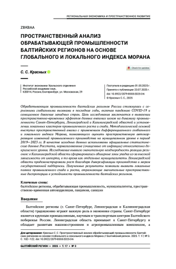 Обрабатывающая промышленность балтийских регионов России столкнулась с серьезными глобальными вызовами в последние годы, включая пандемию COVID-19 и санкционное давление западных стран. Цель исследования заключается в выявлении пространственно-временных эффектов данных внешних шоков на динамику промышленности Санкт-Петербурга, Ленинградской и Калининградской областей и установлении локальных кластеров промышленного роста и спада. Методологической основой выступил пространственный анализ с применением дифференциального глобального и локального индекса Морана, позволяющего оценить пространственную автокорреляцию изменений промышленного производства на муниципальном уровне в период 2019—2023 гг. В качестве исходных данных использованы официальные статистические данные Росстата, нормализованные (очищенные от инфляции) относительно докризисного уровня. Исследование выявило значительную неоднородность реакции регионов: в Калининградской области сформировались обширные зоны упадка из-за высокой зависимости от импорта, в то время как отдельные муниципалитеты Ленинградской области продемонстрировали рост благодаря диверсификации производства и мерам государственной поддержки. Полученные результаты позволили выявить локальные полюса промышленного спада и роста, отражающие значительные пространственные диспропорции в устойчивости промышленности балтийских регионов.