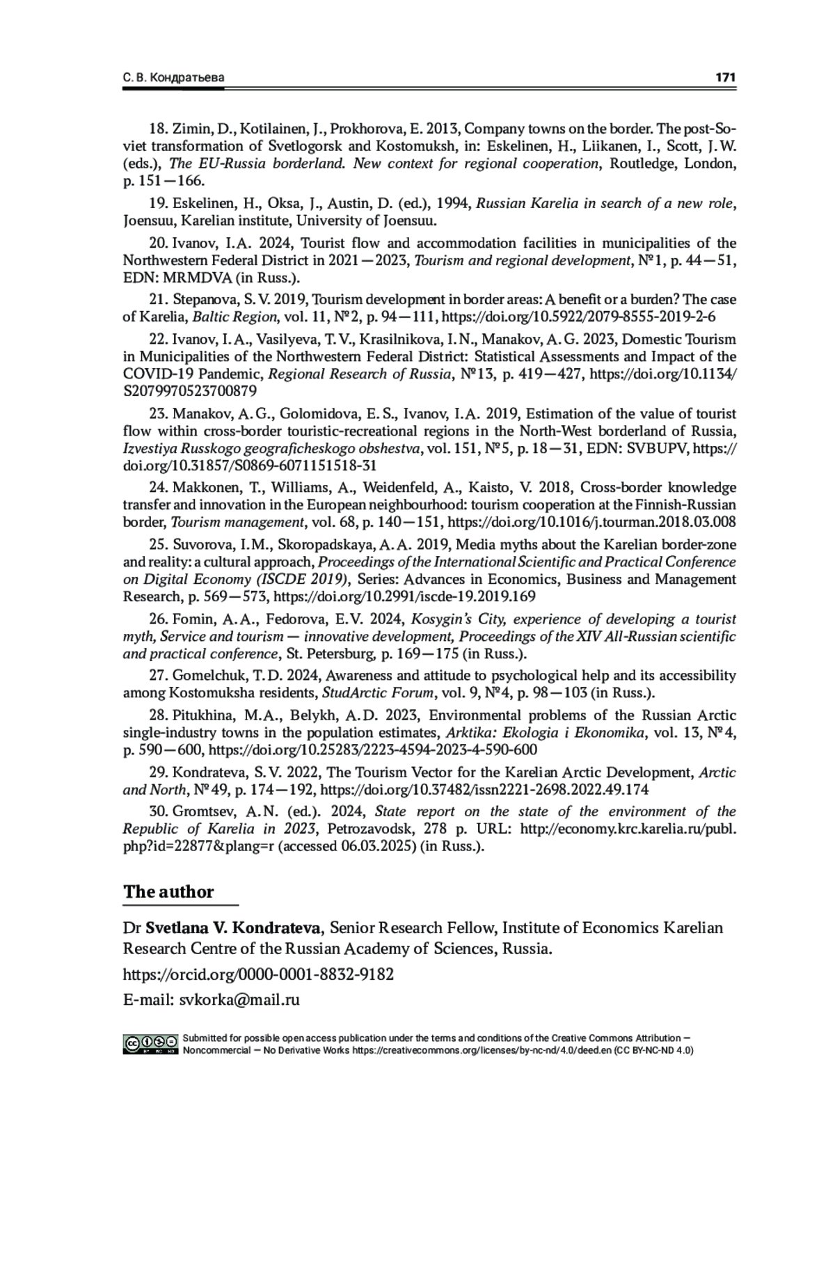 7. Vasilieva, A. V., Volkov, A. D., Karginova-Gubinova, V. V., Tishkov, S. V. 2022, Opportunities of development of eco-tourism in the Karelian Arctic in the conditions of the existing environmental and social challenges, Journal of Risk and Financial Management, vol. 15, No 10, p. 1—19,EDN: VEJPLS, https://doi.org/10.3390/jrfm15100484