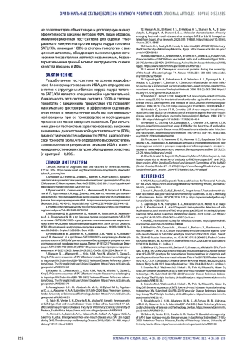 Результаты. Эффективность предложенной тест-системы в регистрации выработки антител к вирусу ящура топотипа SAT2/XIV была выше, чем у других иммуноферментных тест-систем, обладающих выраженной топотипоспецифичностью к возбудителю ящура топотипа SAT2/VII. У отдельных особей крупного рогатого скота специфические антитела выявляли на 7-е сут после вакцинации. Высокие значения диагностической чувствительности (90%), диагностической специфичности (98%) и диагностической точности (95%) определили высокую степень согласованности результатов реакции иммуноферментного анализа с известным диагностическим статусом обследуемых животных (κ-критерий – 0,896).