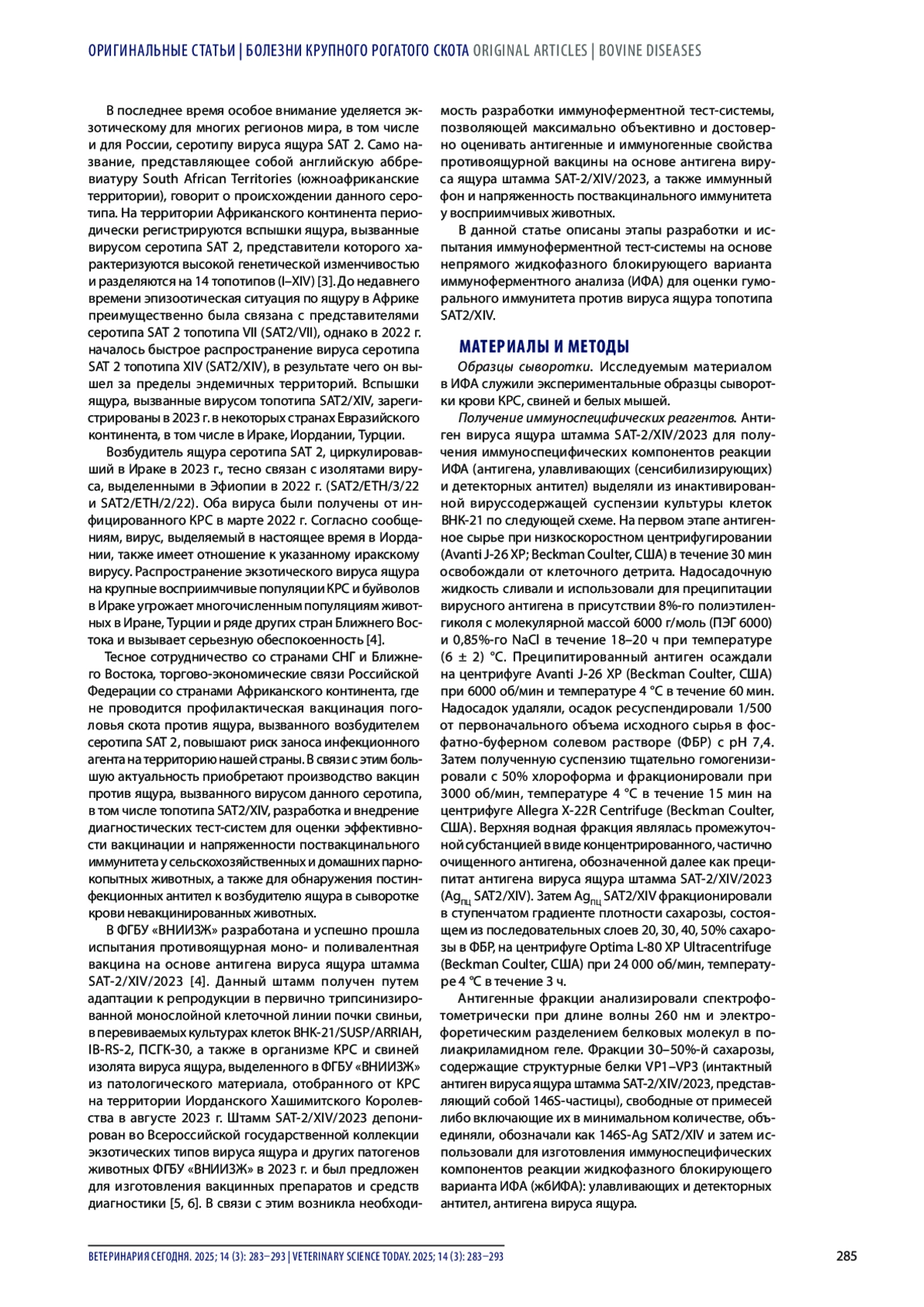 Введение. Ящур – высококонтагиозная, экономически значимая болезнь парнокопытных животных, характеризующаяся везикулярными симптомами. Известны 7 серотипов вируса ящура (A, O, C, SAT 1, SAT 2, SAT 3 и Asia 1), иммунологически отличающихся между собой. В последнее время особое внимание уделяется топотипу вируса ящура SAT2/XIV (South African Territories 2) ввиду его быстрого распространения. Одними из основных методов борьбы с ящуром являются вакцинопрофилактика и оценка иммунного статуса поголовья восприимчивых животных.