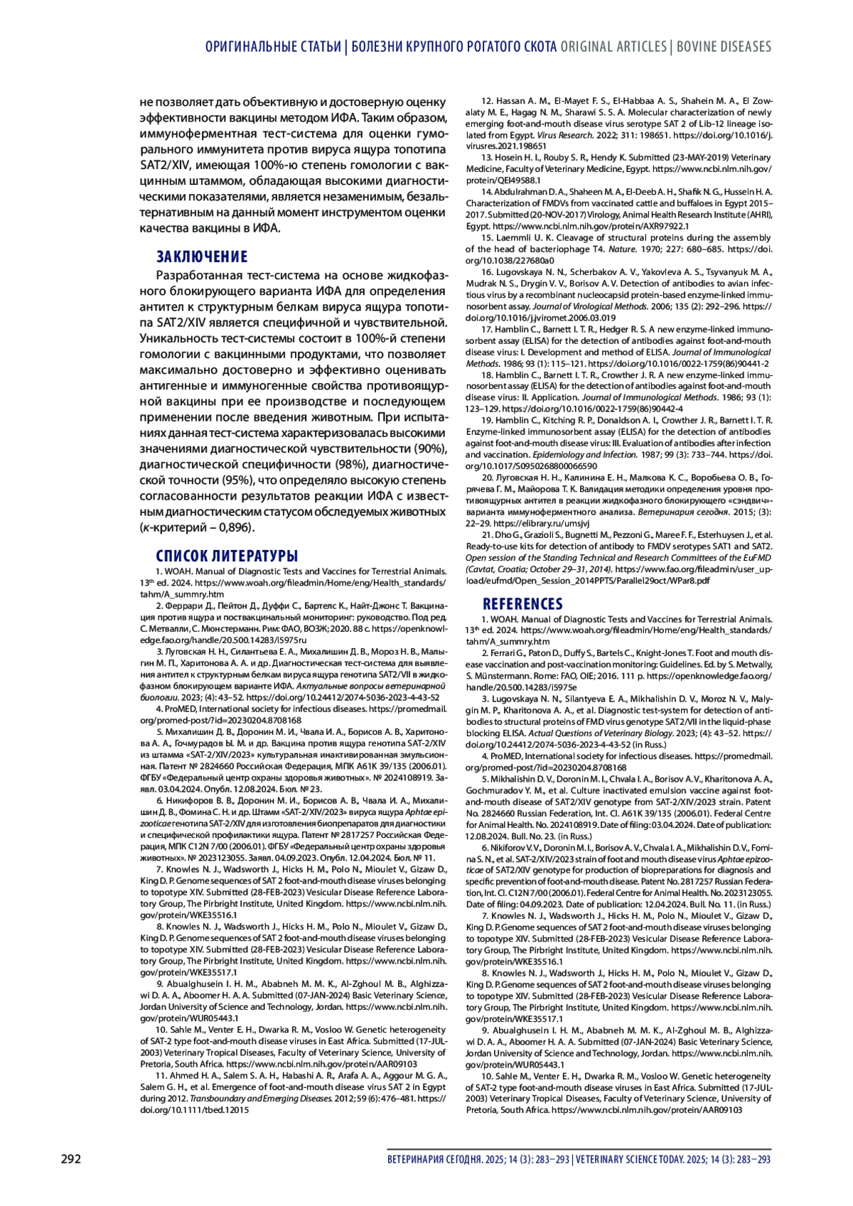 ЛУГОВСКАЯ Н. Н., ЕЛЬКИНА Ю. С., ШЕВЧЕНКО М. А., ГОЧМУРАДОВ Ы. М., КЛЮКИНА Н. Д., МИХАЛИШИН Д. В., БОРИСОВ А. В. РАЗРАБОТКА И ПРИМЕНЕНИЕ ИММУНОФЕРМЕНТНОЙ ТЕСТ-СИСТЕМЫ ДЛЯ ОЦЕНКИ ГУМОРАЛЬНОГО ИММУНИТЕТА ПРОТИВ ВИРУСА ЯЩУРА ТОПОТИПА SAT2/XIV // ВЕТЕРИНАРИЯ СЕГОДНЯ. 2025. № 3, ТОМ 14