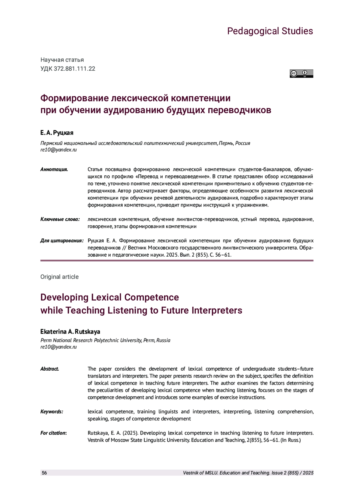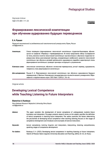 Статья посвящена формированию лексической компетенции студентов-бакалавров, обучающихся по профилю «Перевод и переводоведение». В статье представлен обзор исследований по теме, уточнено понятие лексической компетенции применительно к обучению студентов-переводчиков. Автор рассматривает факторы, определяющие особенности развития лексической компетенции при обучении речевой деятельности аудирования, подробно характеризует этапы формирования компетенции, приводит примеры инструкций к упражнениям.