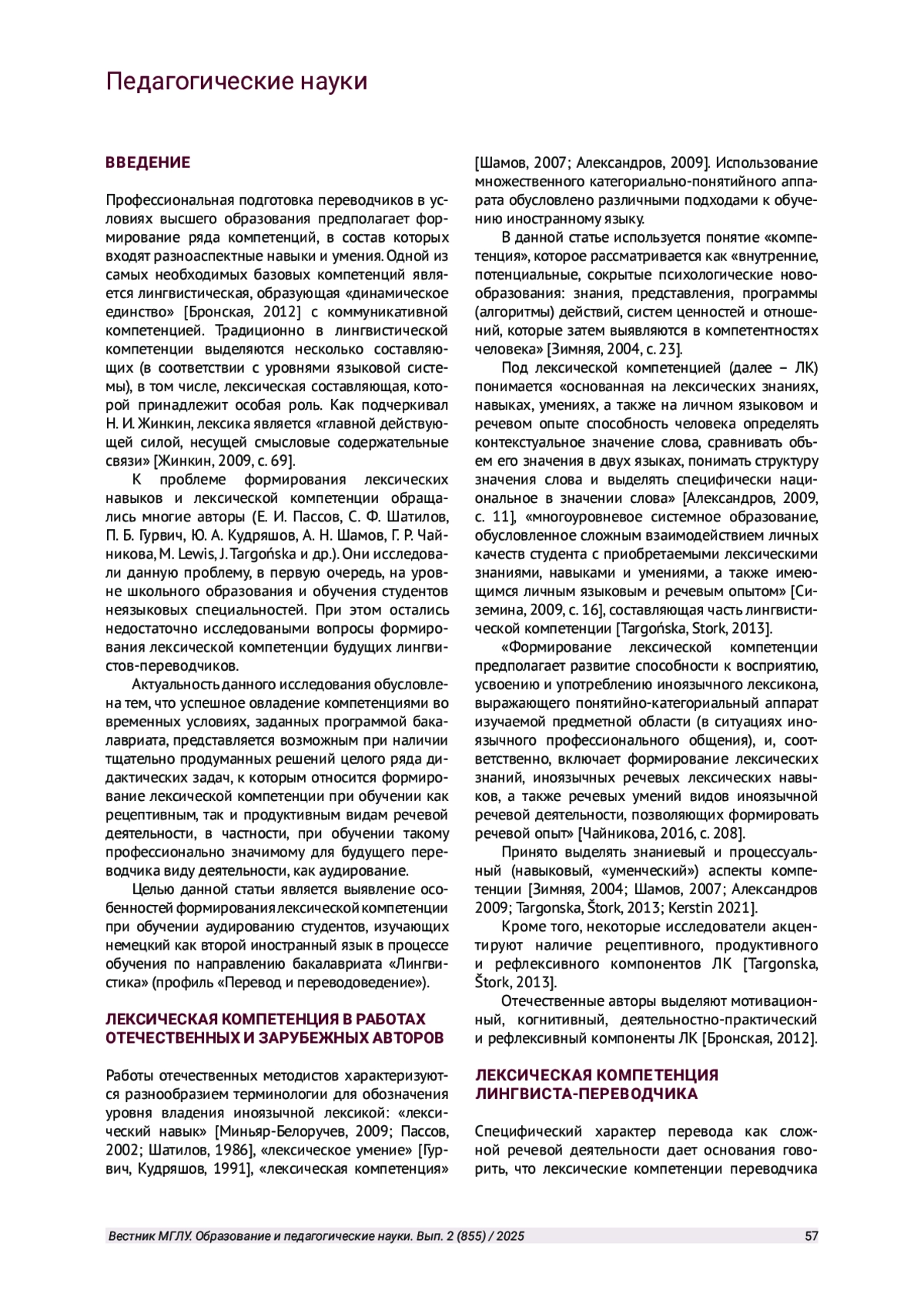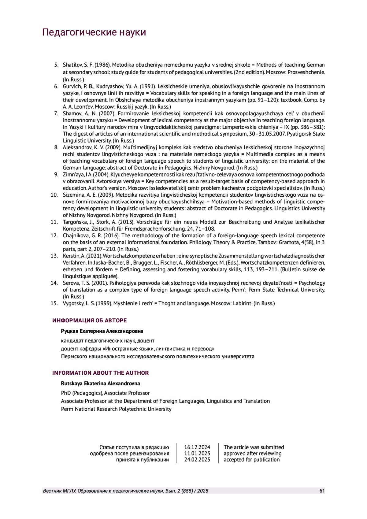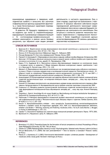 1. Бронская В. С. Теоретические основы формирования лексической компетенции у школьников // Известия ПГПУ им. В. Г. Белинского. 2012. № 28. С. 705-706.