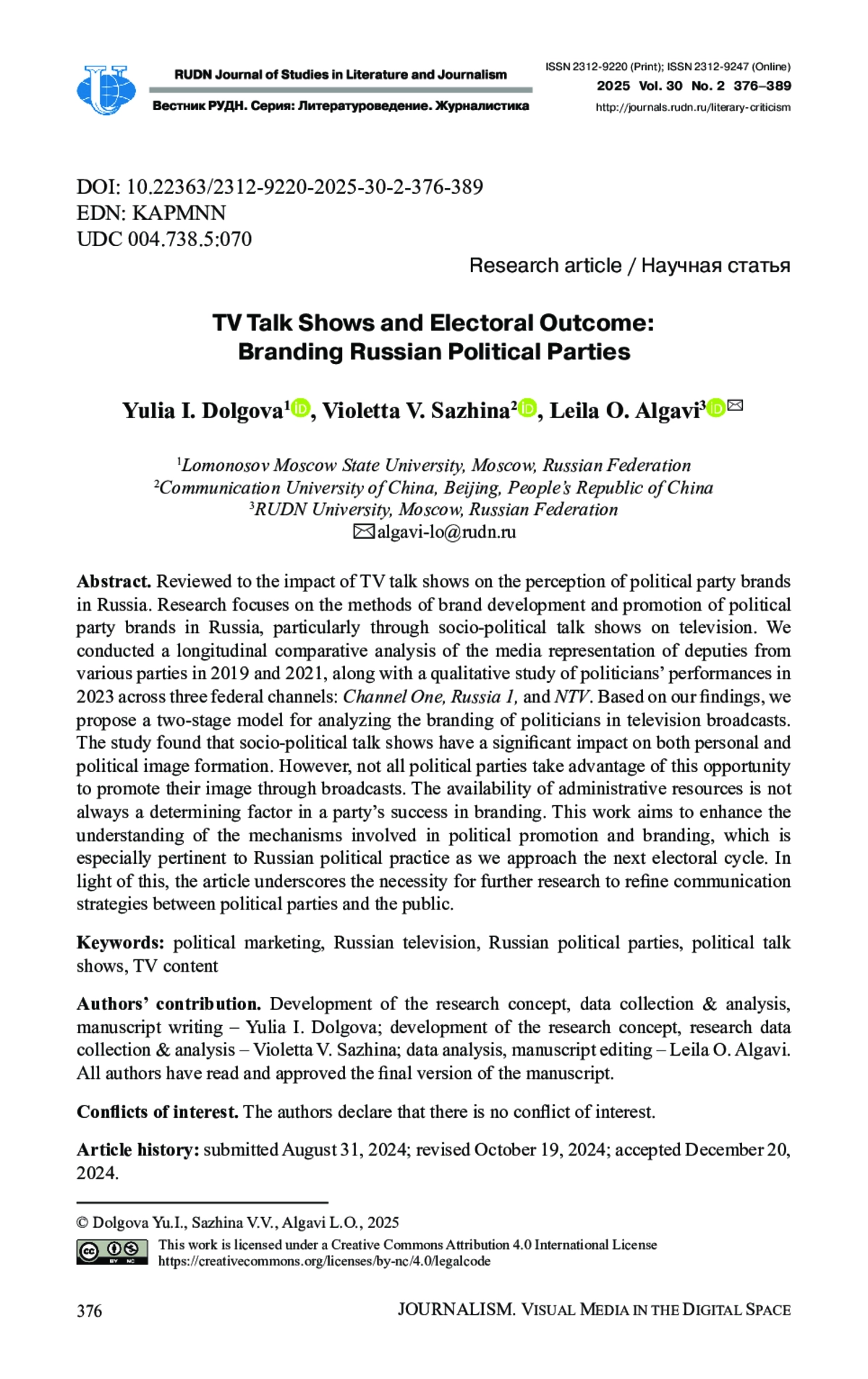 8. Gulenko, P., & Dolgova, Yu. (2020). Evolution of interactive elements in socio-political talk shows in post-Soviet Russia. Global Media and Communication, 17(1), 25-43. DOI: 10.1177/1742766520946471 EDN: HRSUNQ
