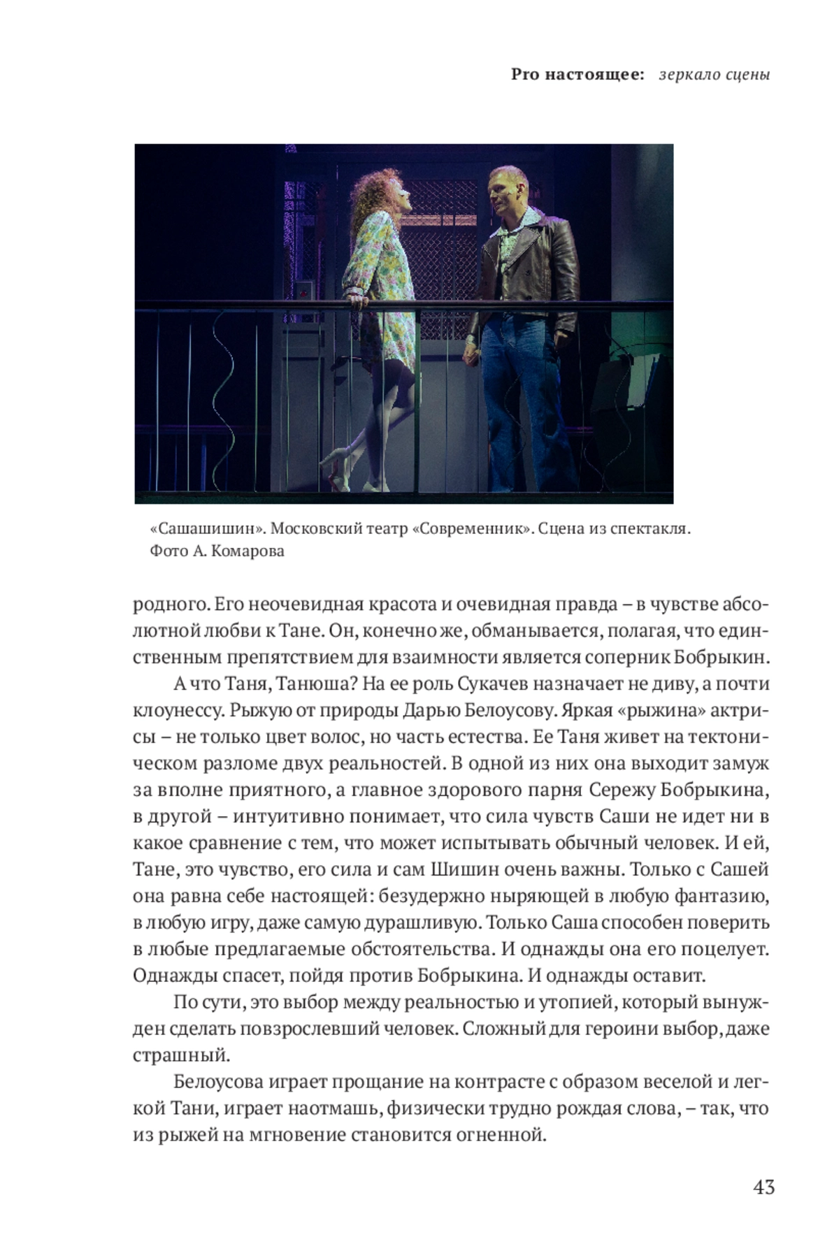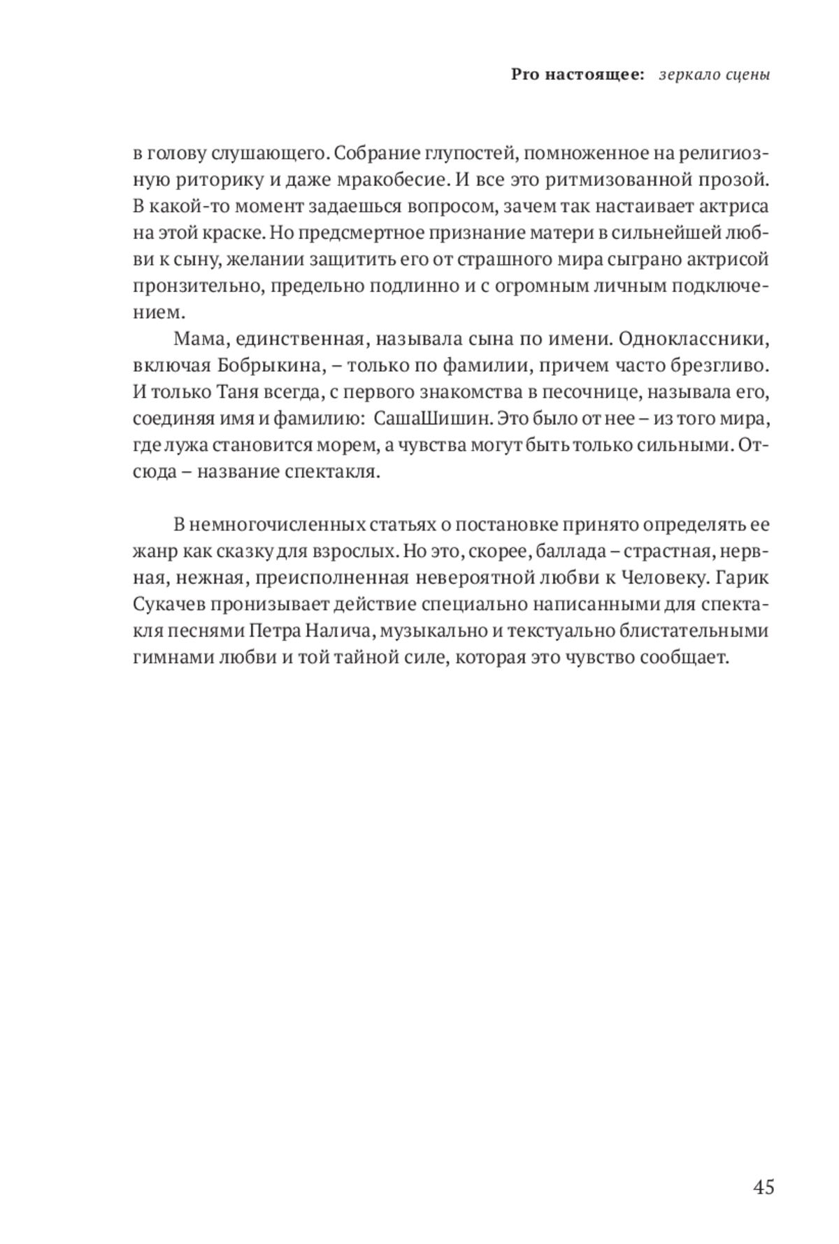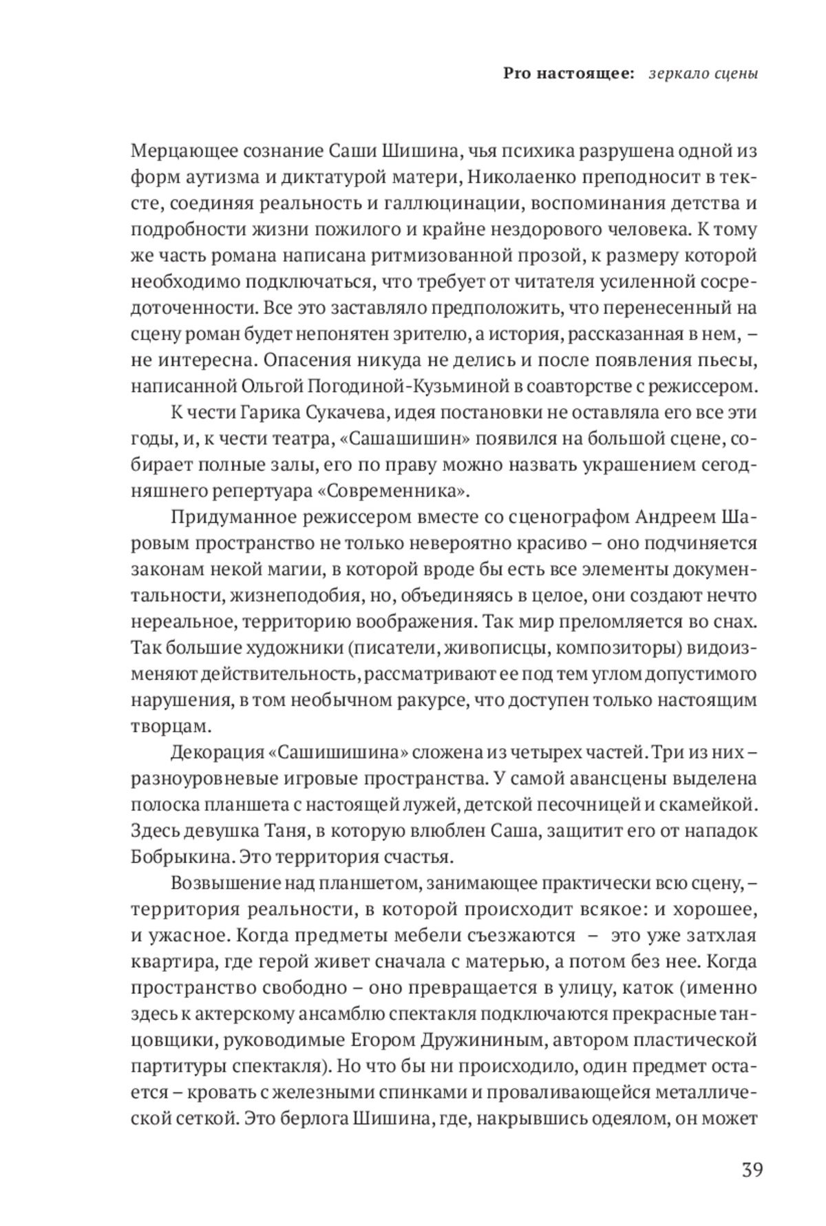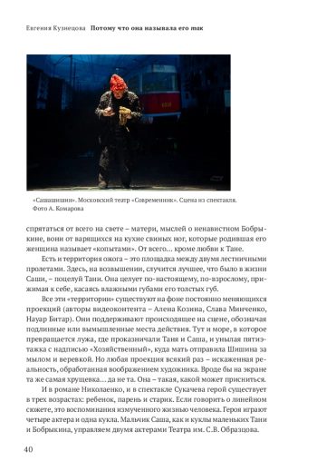 Мерца ю щее сознание Саши Шишина, чья психика разрушена одной из форм аутизма и диктатурой матери, Николаенко преподносит в тексте, соединяя реальность и галлюцинации, воспоминания детства и подробности жизни пожилого и крайне нездорового человека. К тому же часть романа написана ритмизованной прозой, к размеру которой необходимо подключаться, что требует от читателя усиленной сосредоточенности. Все это заставляло предположить, что перенесенный на сцену роман будет непонятен зрителю, а история, рассказанная в нем, – не интересна. Опасения никуда не делись и после появления пьесы, написанной Ольгой Погодиной-Кузьминой в соавторстве с режиссером.