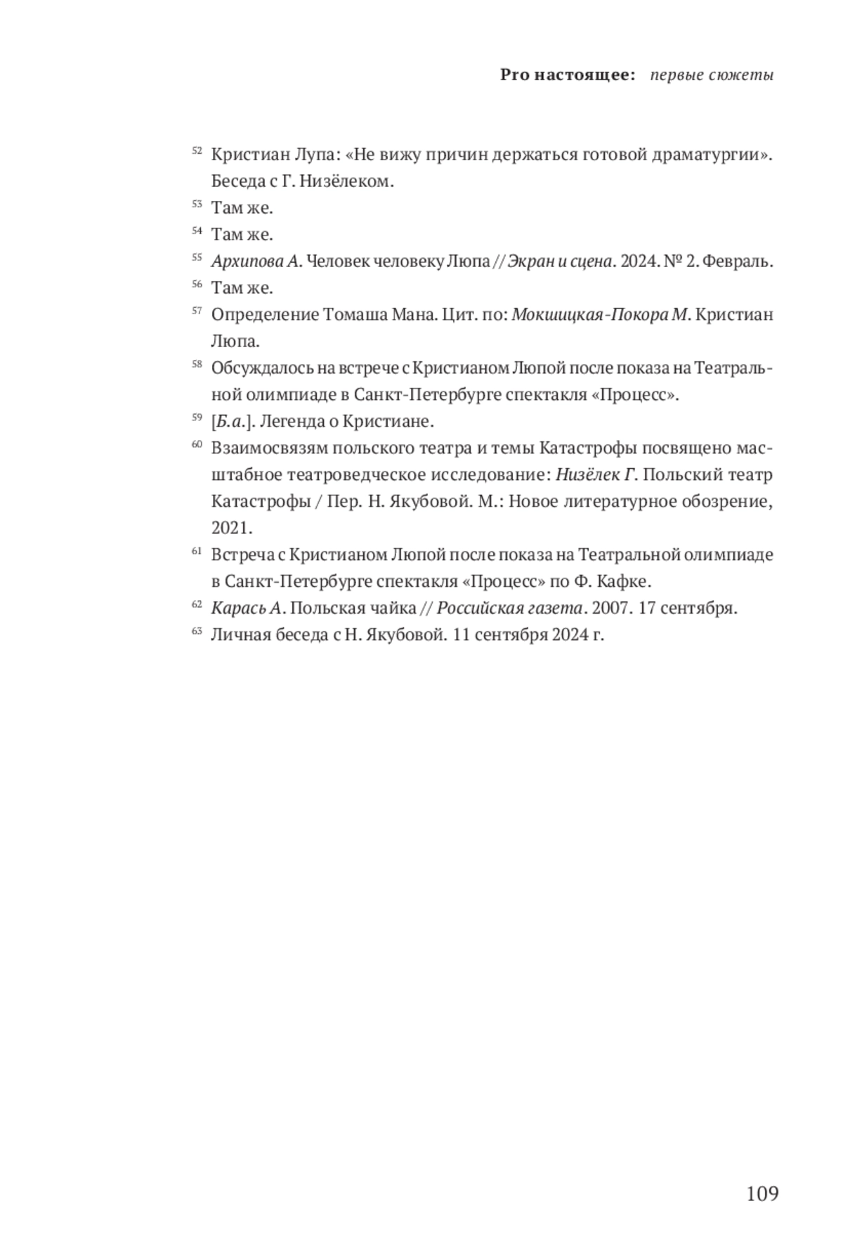 3. Гучальска Б. Во власти мечты: Актер в театре Кристиана Люпы / Пер. Е. Янус // Петербургский театральный журнал. 2018. № 1. С. 134. В случае с первой из двух цитат автор статьи ссылается на формулировку французского театрального критика Ж.П. Леонардини.