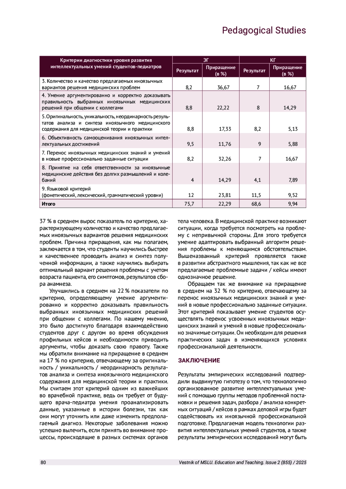 В статье представлены эмпирические исследования технологично организованного развития интеллектуальных умений на занятиях по иностранному языку студентов, обучающихся по специальности «Педиатрия». По результатам анализа эмпирического материала было выявлено, что последовательное применение на занятиях группы методов проблемной постановки и решения задач, разбора / анализа конкретных ситуаций / кейсов в рамках деловой игры повышает качество иноязычной подготовки обучающихся.