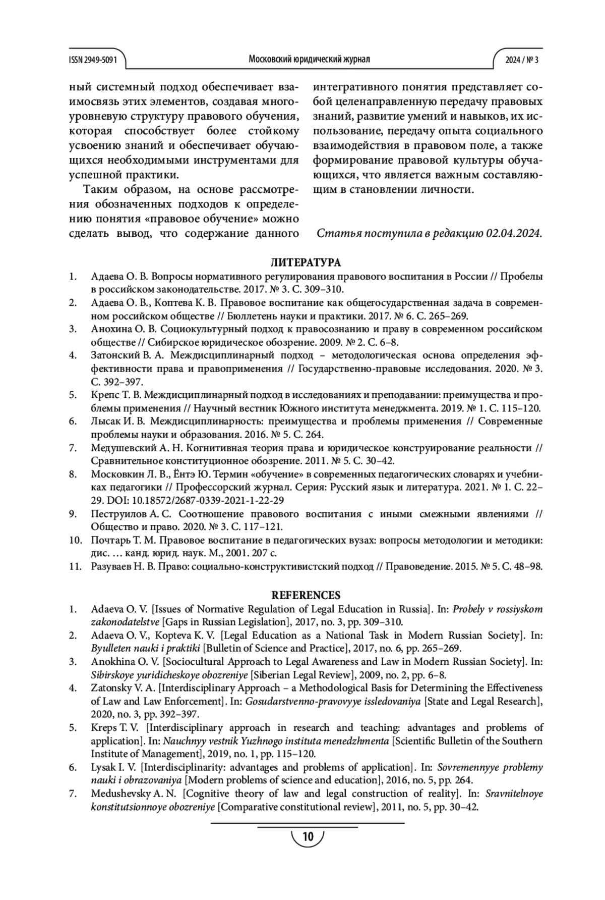 4. Затонский В. А. Междисциплинарный подход - методологическая основа определения эффективности права и правоприменения // Государственно-правовые исследования. 2020. № 3. С. 392-397.