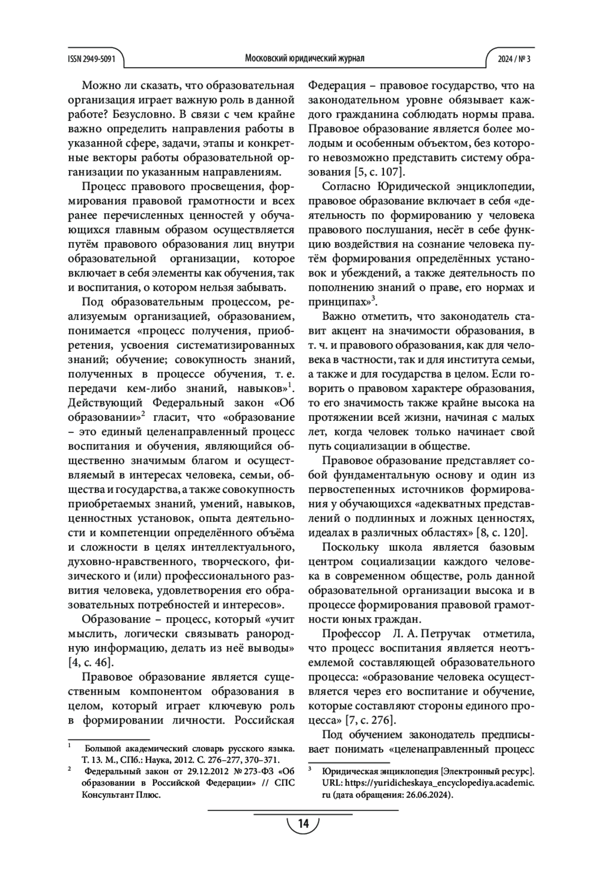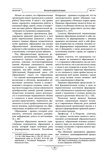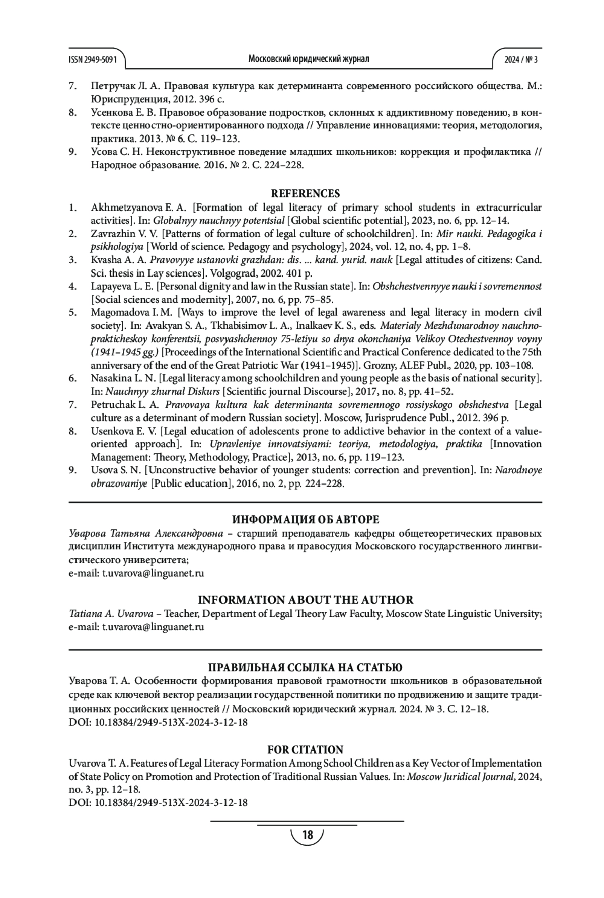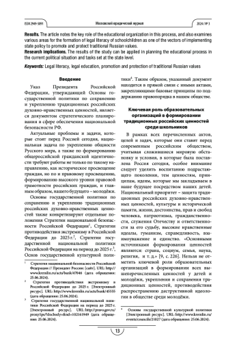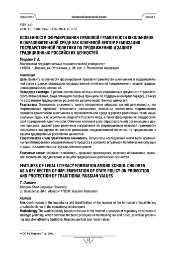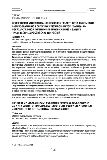 УВАРОВА Т. А. ОСОБЕННОСТИ ФОРМИРОВАНИЯ ПРАВОВОЙ ГРАМОТНОСТИ ШКОЛЬНИКОВ В ОБРАЗОВАТЕЛЬНОЙ СРЕДЕ КАК КЛЮЧЕВОЙ ВЕКТОР РЕАЛИЗАЦИИ ГОСУДАРСТВЕННОЙ ПОЛИТИКИ ПО ПРОДВИЖЕНИЮ И ЗАЩИТЕ ТРАДИЦИОННЫХ РОССИЙСКИХ ЦЕННОСТЕЙ // МОСКОВСКИЙ ЮРИДИЧЕСКИЙ ЖУРНАЛ. 2024. 2024 / №3
