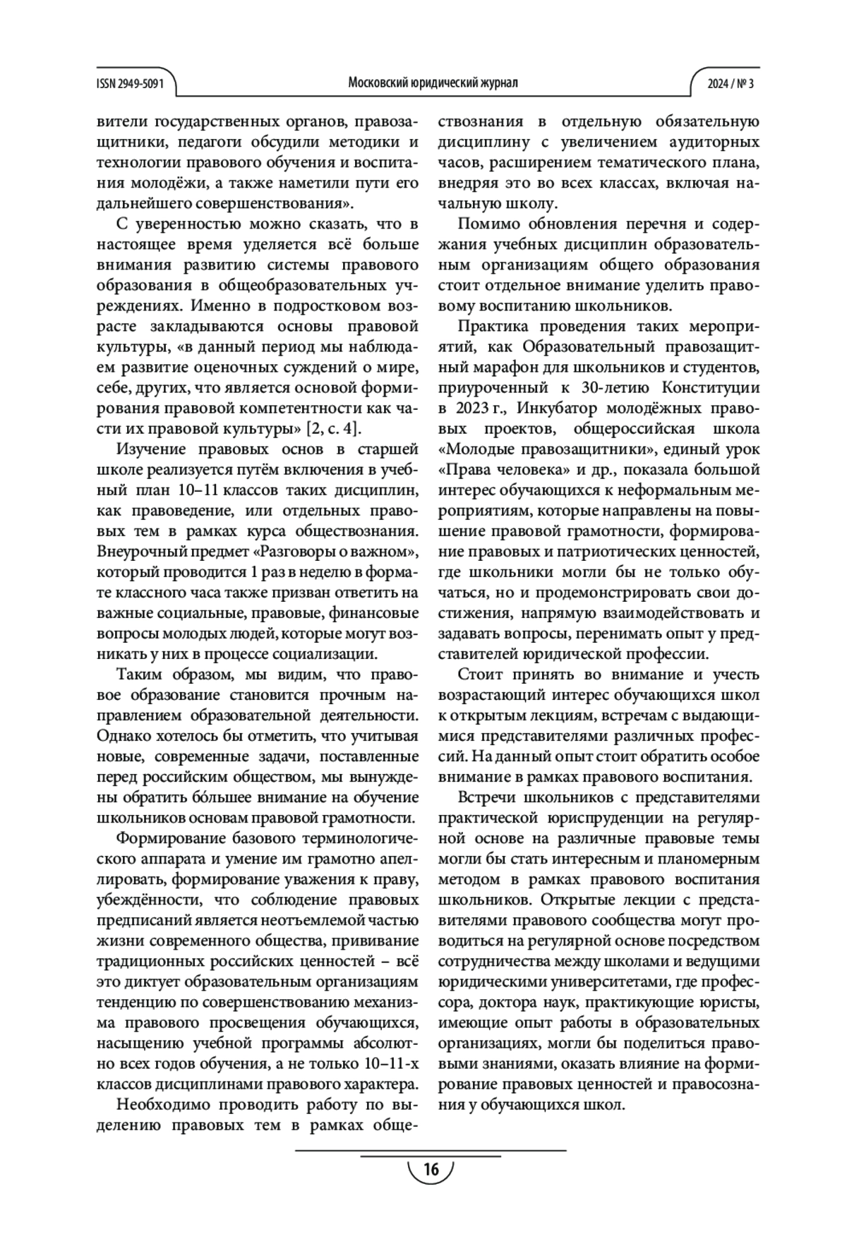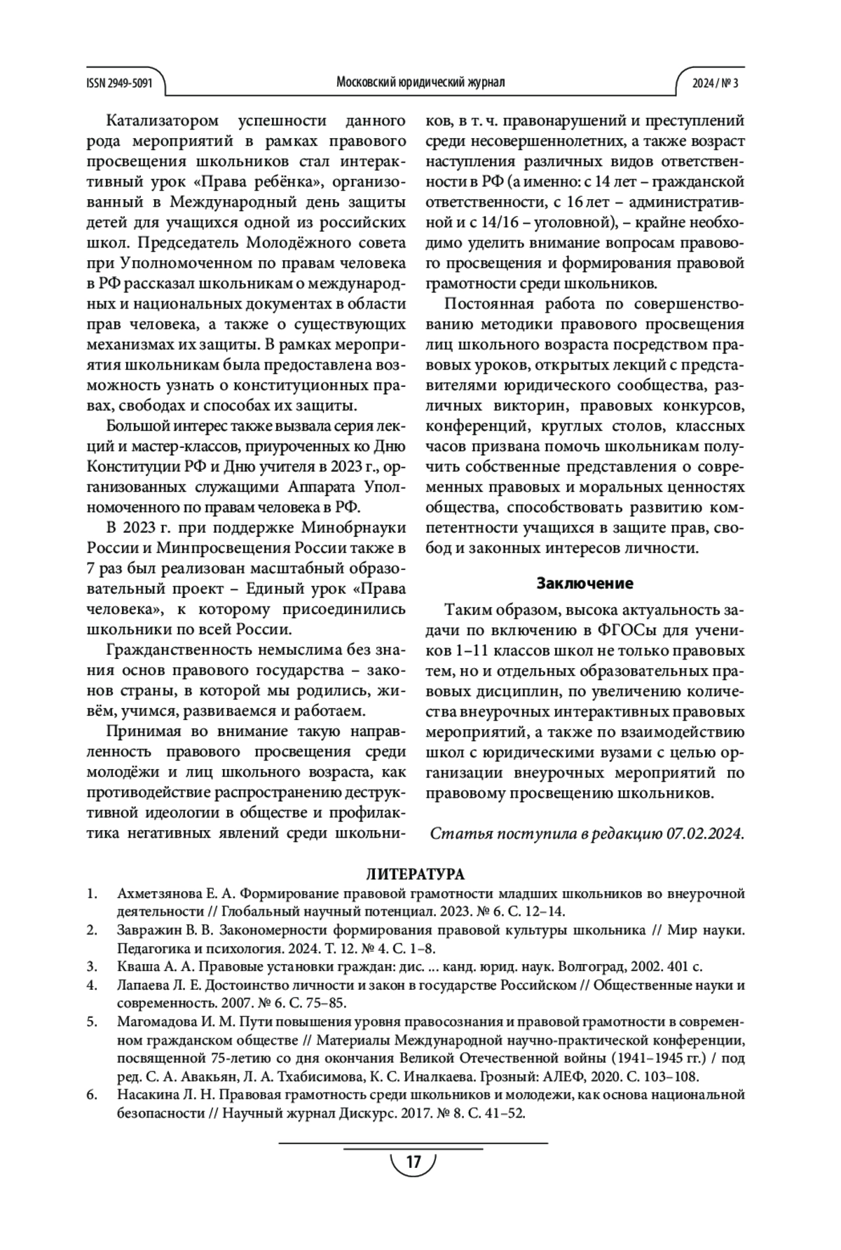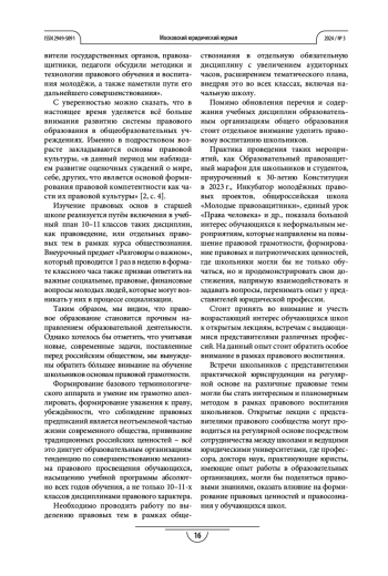 Статья: Особенности формирования правовой грамотности школьников в образовательной среде как ключевой вектор реализации государственной политики по продвижению и защите традиционных российских ценностей (2024)