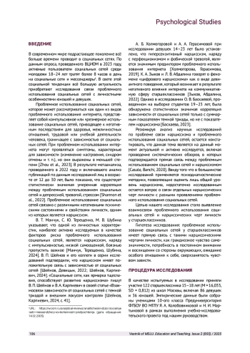 В статье представлены результаты исследования, направленного на выявление взаимосвязи проблемного использования социальных сетей и нарциссических черт личности у старшеклассников. В исследовании приняли участие 122 школьника 15-18 лет. По результатам исследования сделан вывод о том, что проблемное использование социальных сетей имеет прямую связь с такими нарциссическими чертами личности, как чувство зависти, ожидание особого отношения к себе, поглощенность фантазиями о своей славе, потребность в постоянном внимании и восхищении.