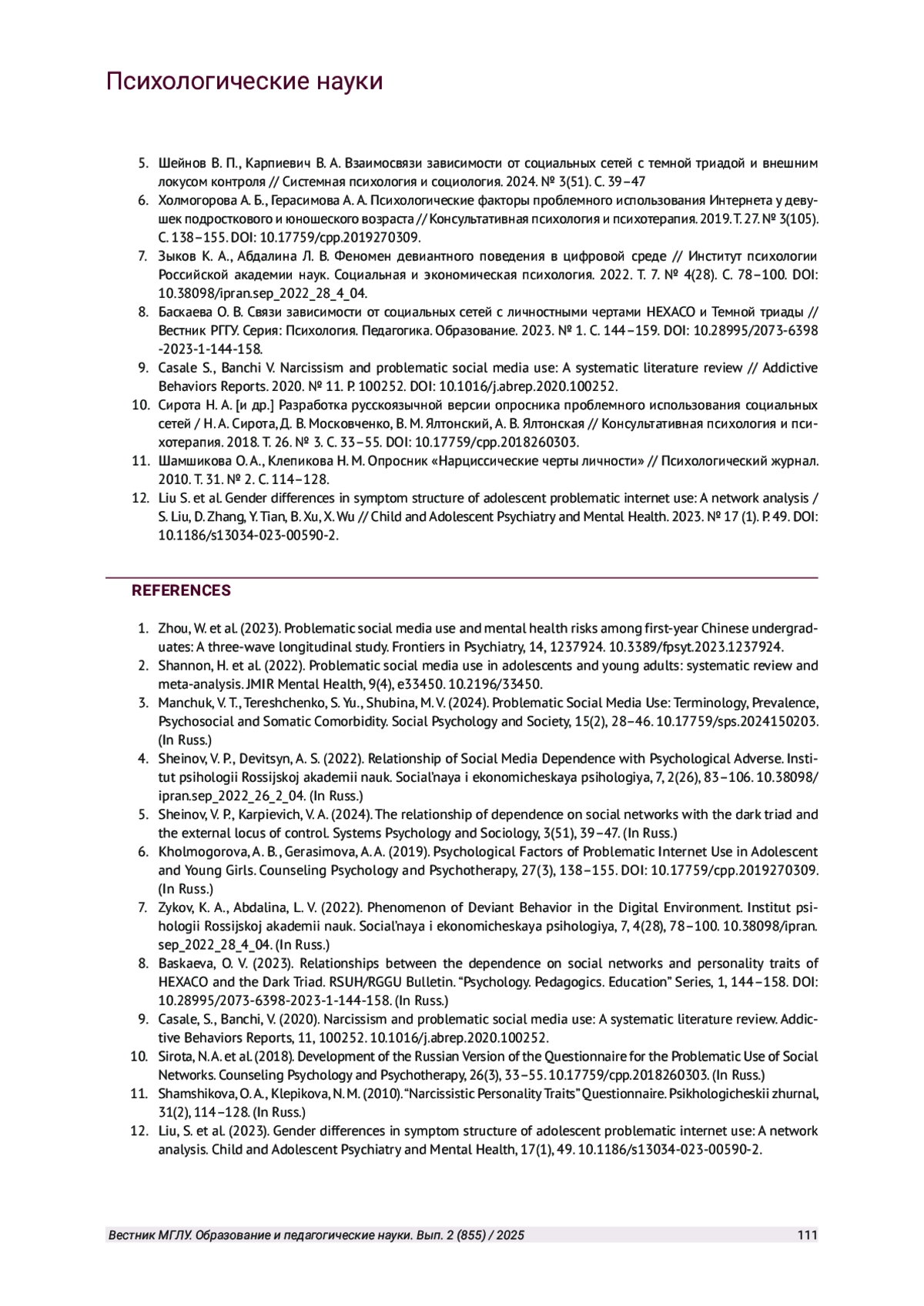 8. Баскаева О. В. Связи зависимости от социальных сетей с личностными чертами HEXACO и Темной триады // Вестник РГГУ. Серия: Психология. Педагогика. Образование. 2023. № 1. С. 144-159. 10.28995/2073-6398 -2023-1-144-158. DOI: 10.28995/2073-6398-2023-1-144-158 EDN: TEZIHQ