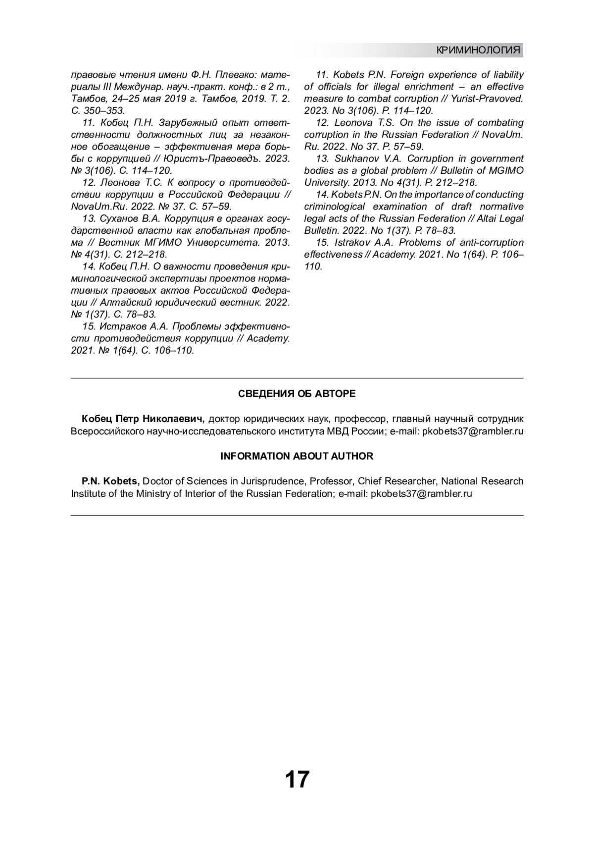 КОБЕЦ П. Н. ПРОТИВОДЕЙСТВИЕ КОРРУПЦИИ В РОССИЙСКОЙ ФЕДЕРАЦИИ: ОПЫТ, ПРОБЛЕМЫ, ПУТИ СОВЕРШЕНСТВОВАНИЯ // ОБЩЕСТВО И ПРАВО. 2024. № 3 (89)