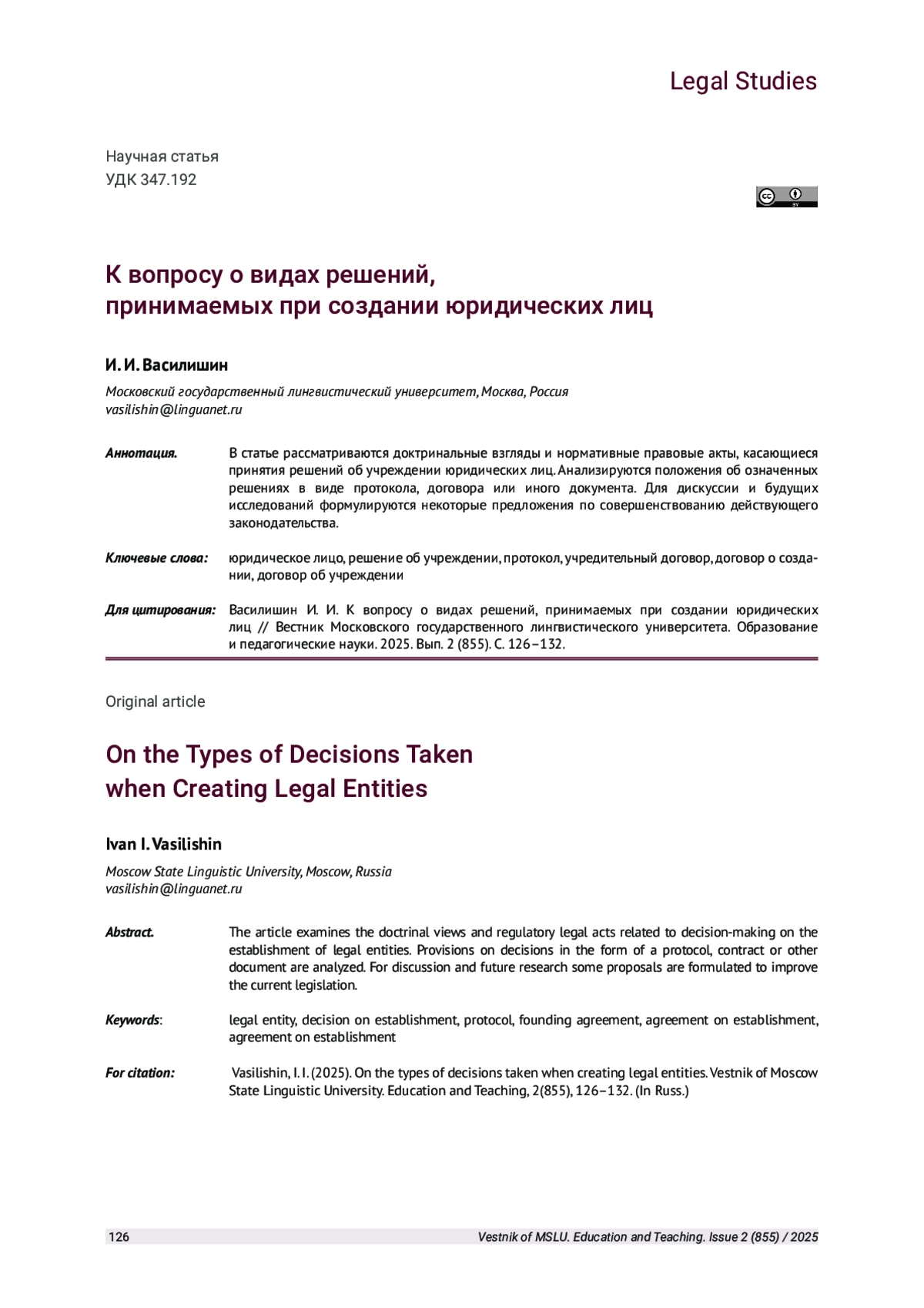 В статье рассматриваются доктринальные взгляды и нормативные правовые акты, касающиеся принятия решений об учреждении юридических лиц. Анализируются положения об означенных решениях в виде протокола, договора или иного документа. Для дискуссии и будущих исследований формулируются некоторые предложения по совершенствованию действующего законодательства.