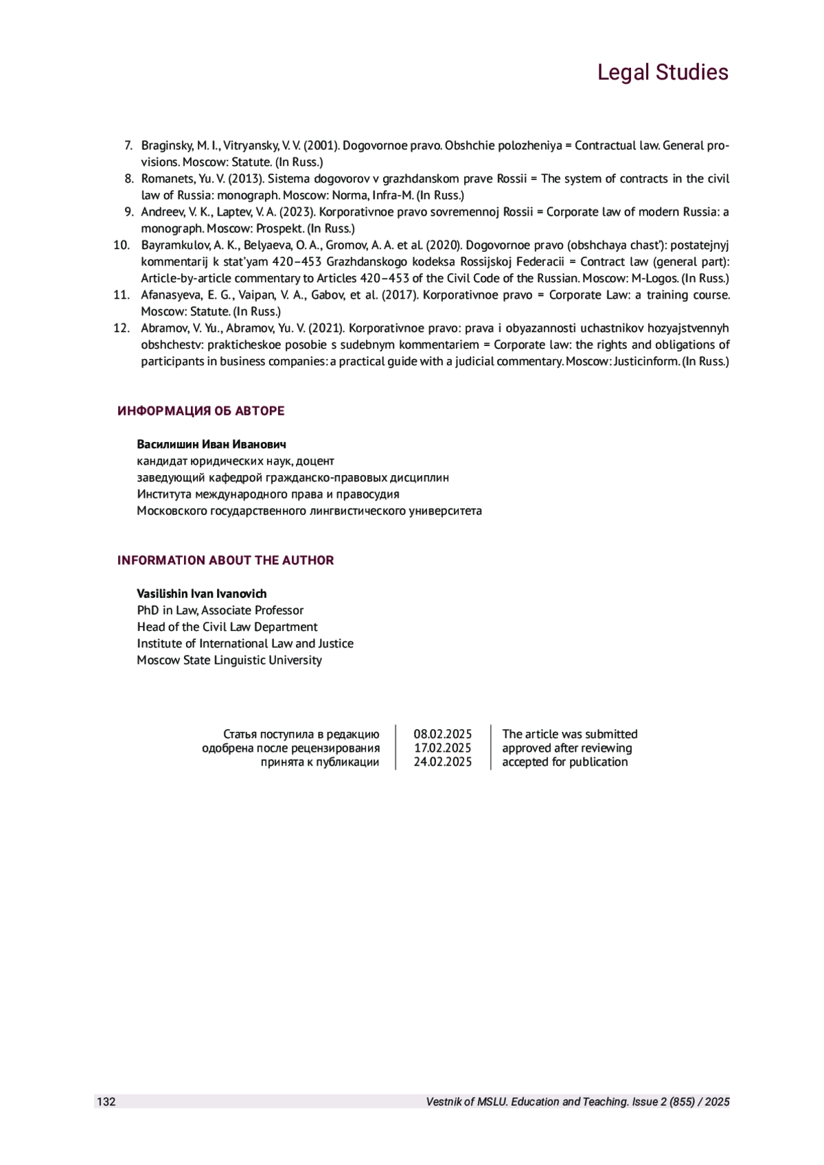 12. Абрамов В. Ю., Абрамов Ю. В. Корпоративное право: права и обязанности участников хозяйственных обществ: практическое пособие с судебным комментарием. М.: Юстицинформ, 2021. EDN: HXXAPI