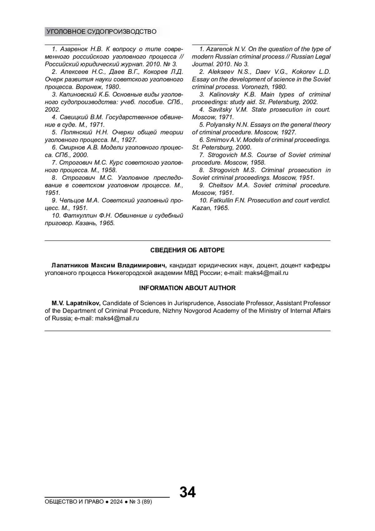 ЛАПАТНИКОВ М. В. ОБВИНЕНИЕ КАК ДВИЖУЩАЯ СИЛА СОВЕТСКОГО УГОЛОВНОГО ПРОЦЕССА // ОБЩЕСТВО И ПРАВО. 2024. № 3 (89)