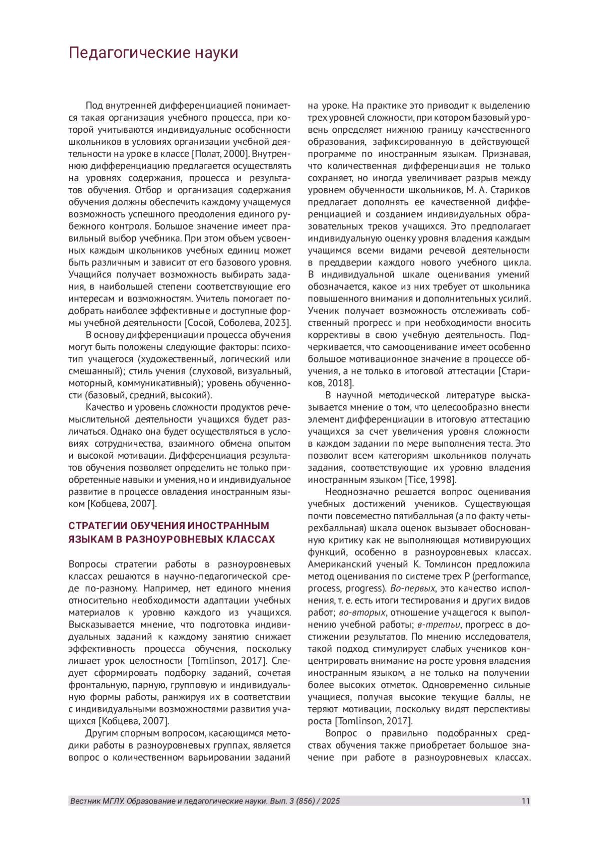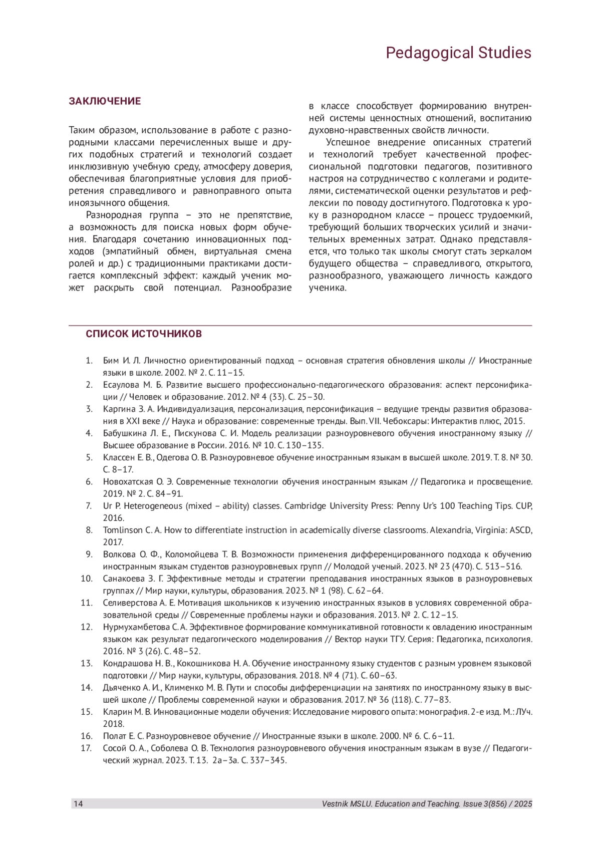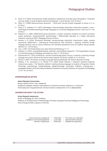 17. Сосой О. А., Соболева О. В. Технология разноуровневого обучения иностранным языкам в вузе // Педагогический журнал. 2023. Т. 13. 2а-3а. С. 337-345. EDN: IIMUDL
