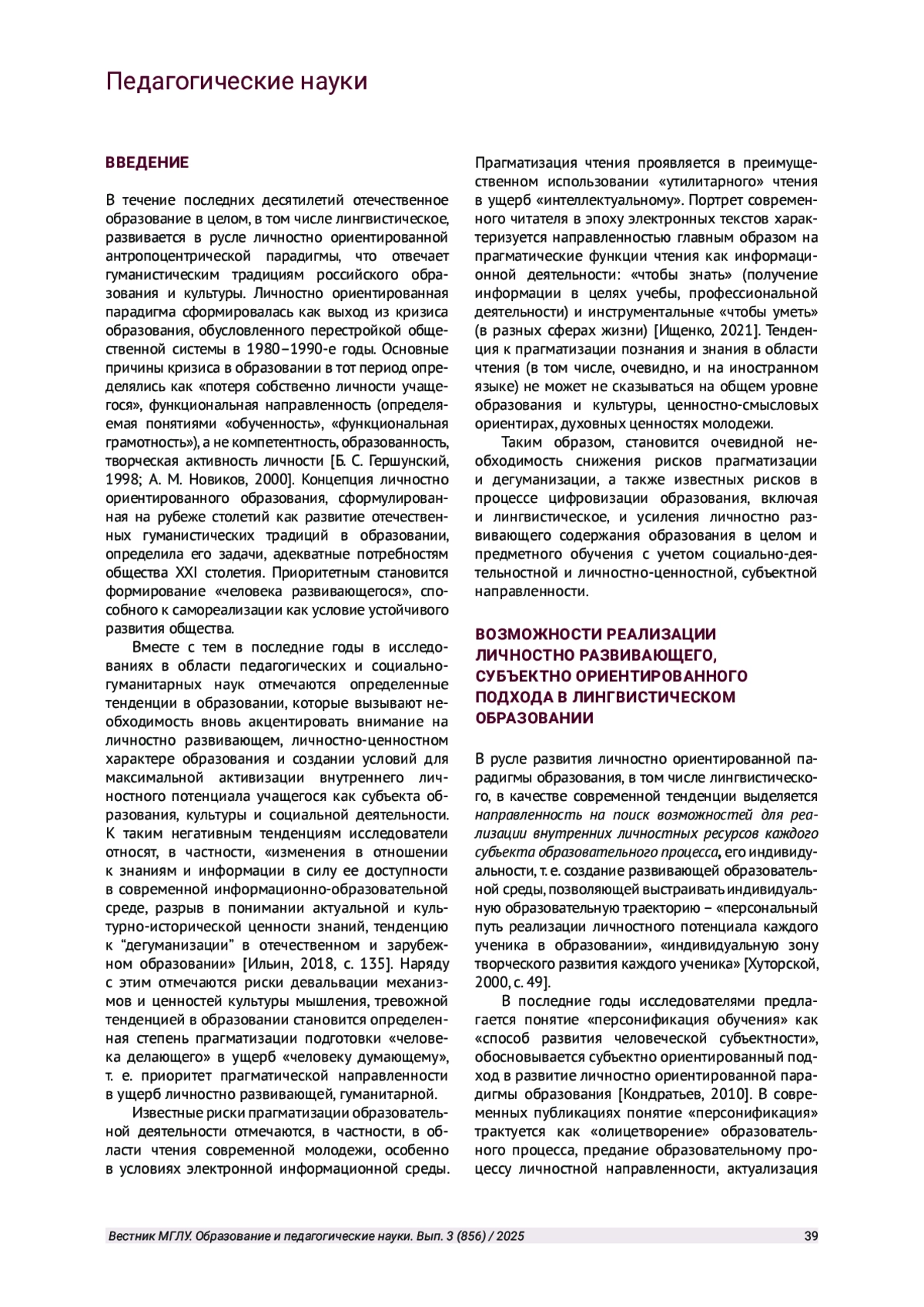 В течение последних десятилетий отечественное образование в целом, в том числе лингвистическое, развивается в русле личностно ориентированной антропоцентрической парадигмы, что отвечает гуманистическим традициям российского образования и культуры. Личностно ориентированная парадигма сформировалась как выход из кризиса образования, обусловленного перестройкой общественной системы в 1980–1990-е годы.