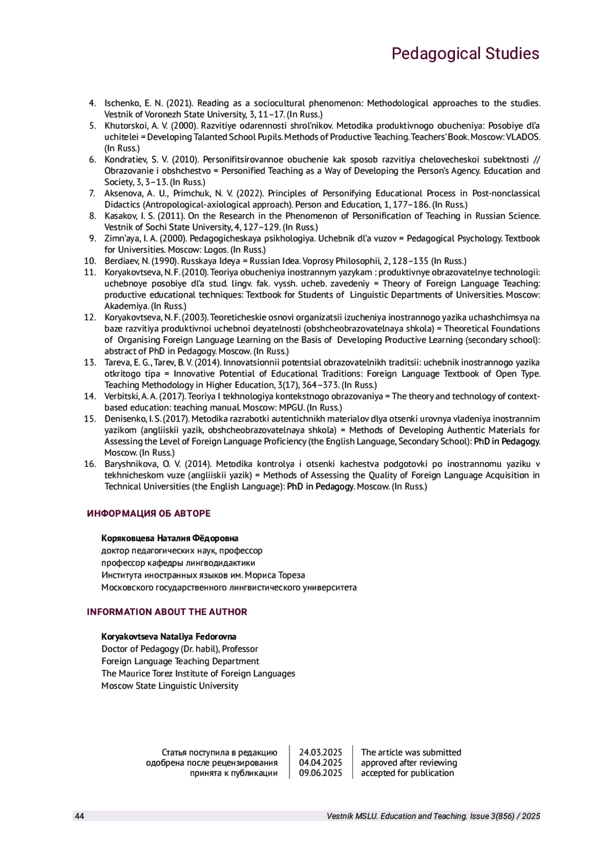 12. Коряковцева Н. Ф. Теоретические основы организации изучения иностранного языка учащимся на базе развития продуктивной учебной деятельности (общеобразовательная школа): автореф. дис. … д-ра пед. наук. М., 2003. EDN: ZMSMFH