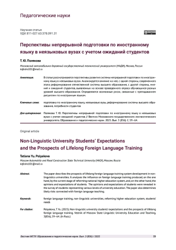 ПОЛЯКОВА Т. Ю. ПЕРСПЕКТИВЫ НЕПРЕРЫВНОЙ ПОДГОТОВКИ ПО ИНОСТРАННОМУ ЯЗЫКУ В НЕЯЗЫКОВЫХ ВУЗАХ С УЧЕТОМ ОЖИДАНИЙ СТУДЕНТОВ // ВЕСТНИК МОСКОВСКОГО ГОСУДАРСТВЕННОГО ЛИНГВИСТИЧЕСКОГО УНИВЕРСИТЕТА. ОБРАЗОВАНИЕ И ПЕДАГОГИЧЕСКИЕ НАУКИ. 2025. № 3 (856)