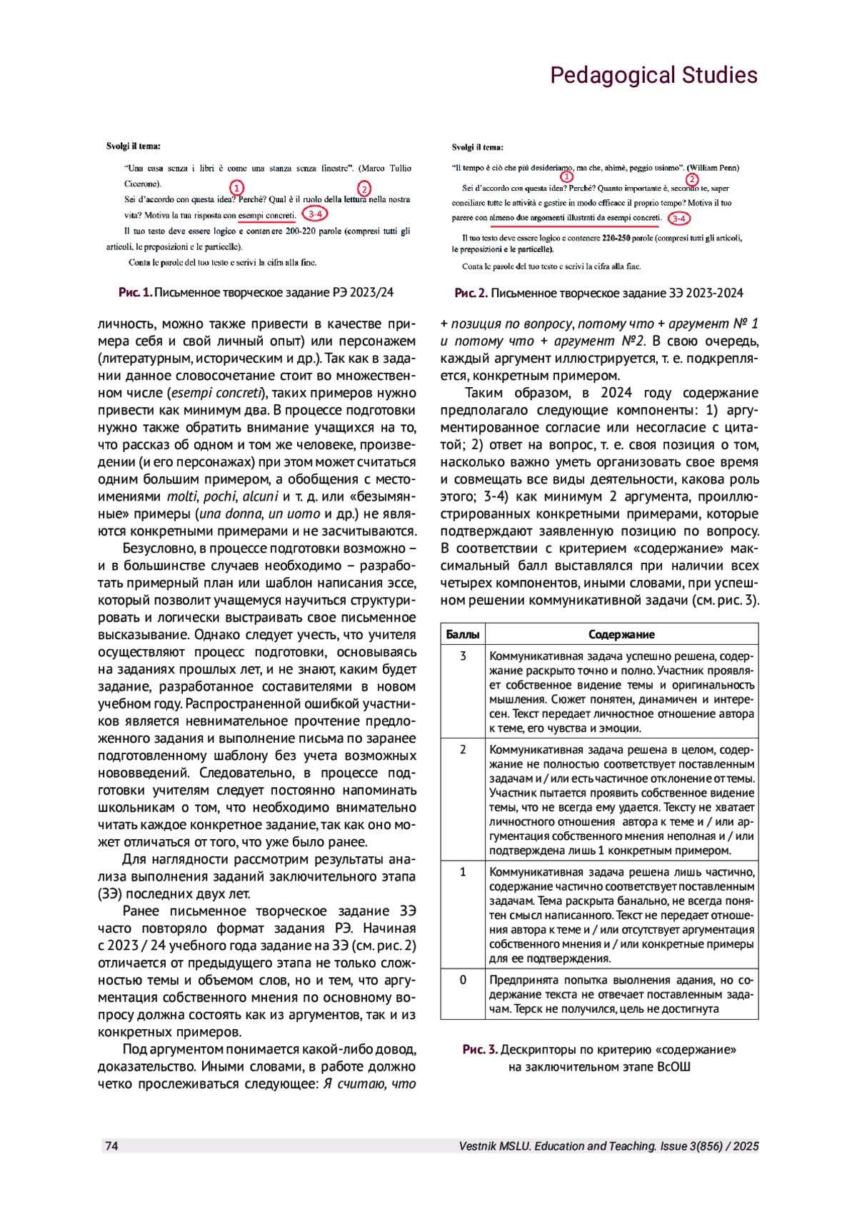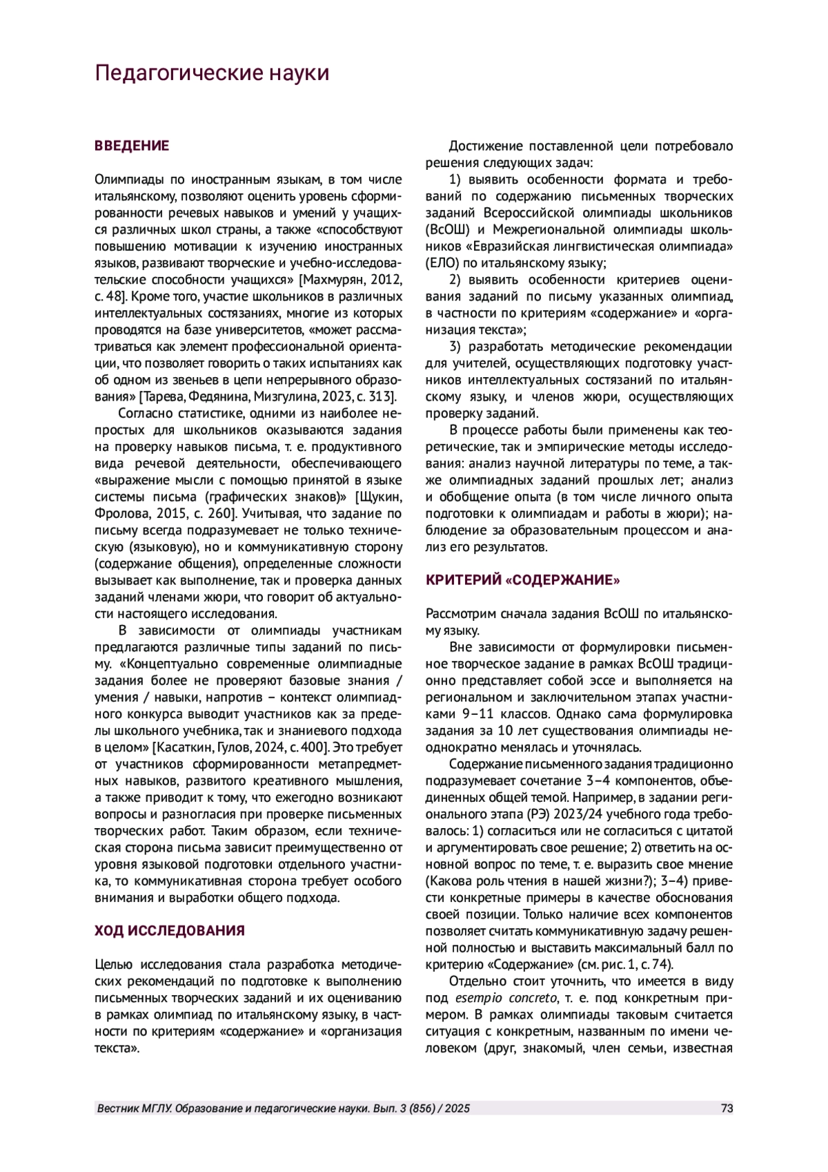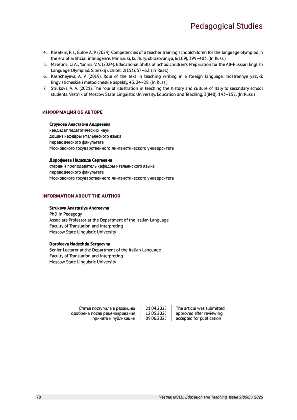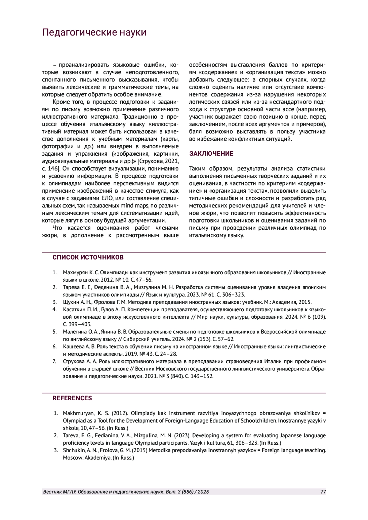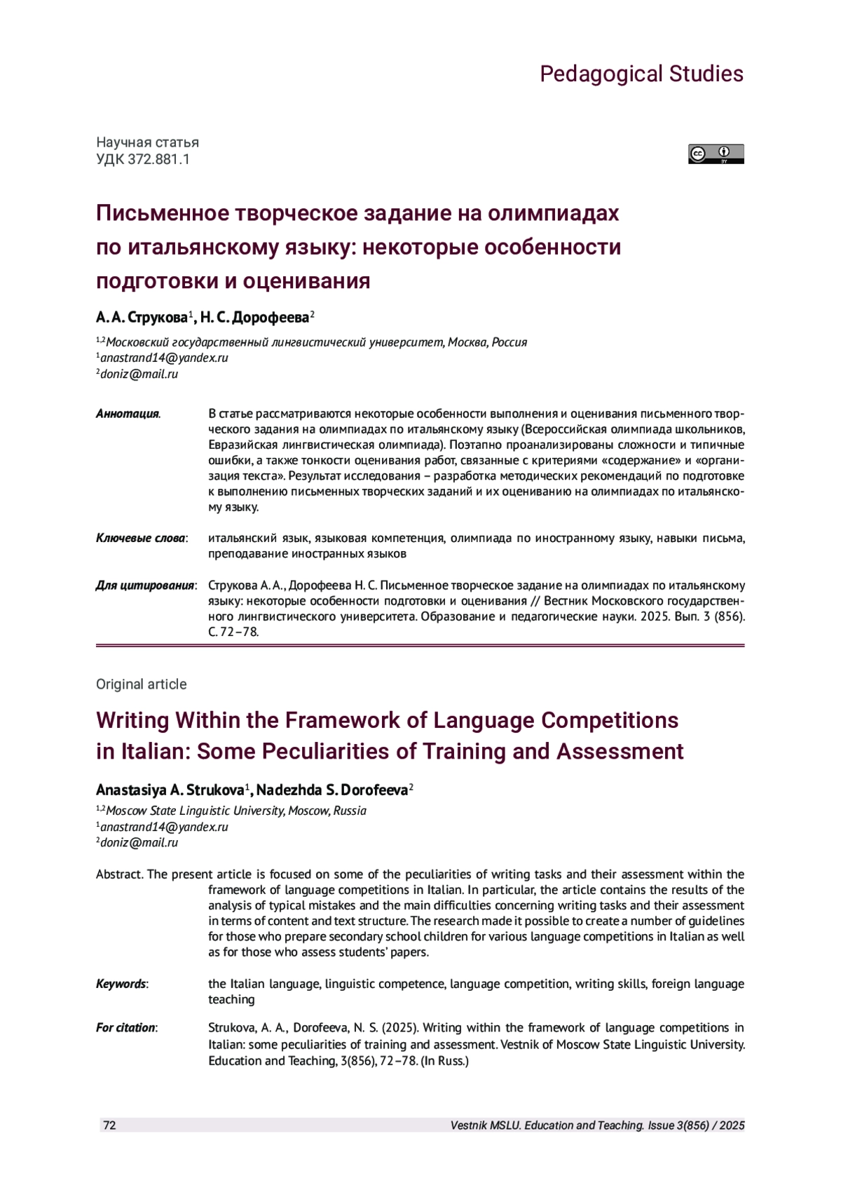 СТРУКОВА А. А., ДОРОФЕЕВА Н. С. ПИСЬМЕННОЕ ТВОРЧЕСКОЕ ЗАДАНИЕ НА ОЛИМПИАДАХ ПО ИТАЛЬЯНСКОМУ ЯЗЫКУ: НЕКОТОРЫЕ ОСОБЕННОСТИ ПОДГОТОВКИ И ОЦЕНИВАНИЯ // ВЕСТНИК МОСКОВСКОГО ГОСУДАРСТВЕННОГО ЛИНГВИСТИЧЕСКОГО УНИВЕРСИТЕТА. ОБРАЗОВАНИЕ И ПЕДАГОГИЧЕСКИЕ НАУКИ. 2025. № 3 (856)