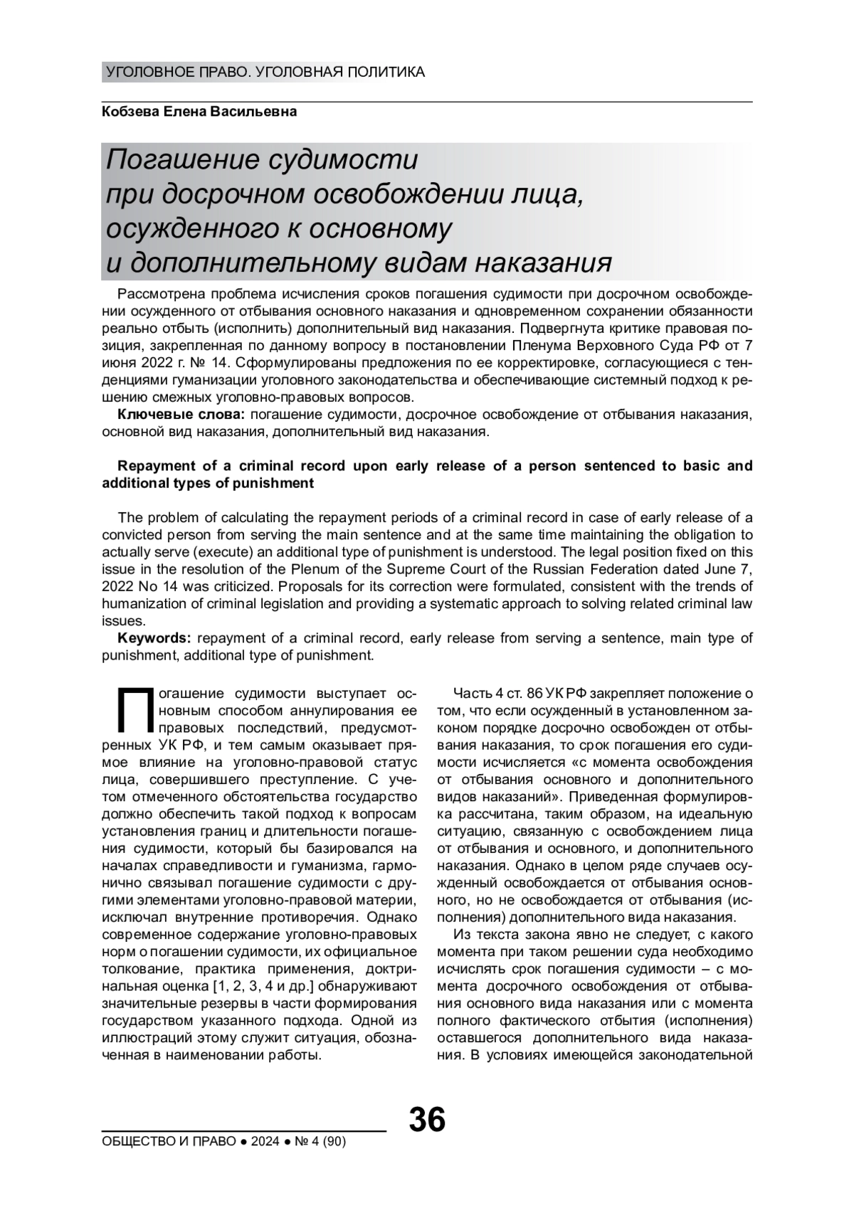 Рассмотрена проблема исчисления сроков погашения судимости при досрочном освобождении осужденного от отбывания основного наказания и одновременном сохранении обязанности реально отбыть (исполнить) дополнительный вид наказания. Подвергнута критике правовая позиция, закрепленная по данному вопросу в постановлении Пленума Верховного Суда РФ от 7 июня 2022 г. No 14. Сформулированы предложения по ее корректировке, согласующиеся с тенденциями гуманизации уголовного законодательства и обеспечивающие системный подход к решению смежных уголовно-правовых вопросов