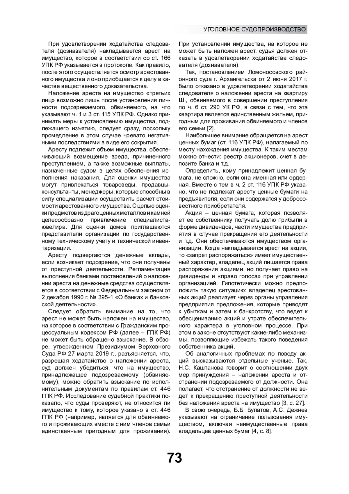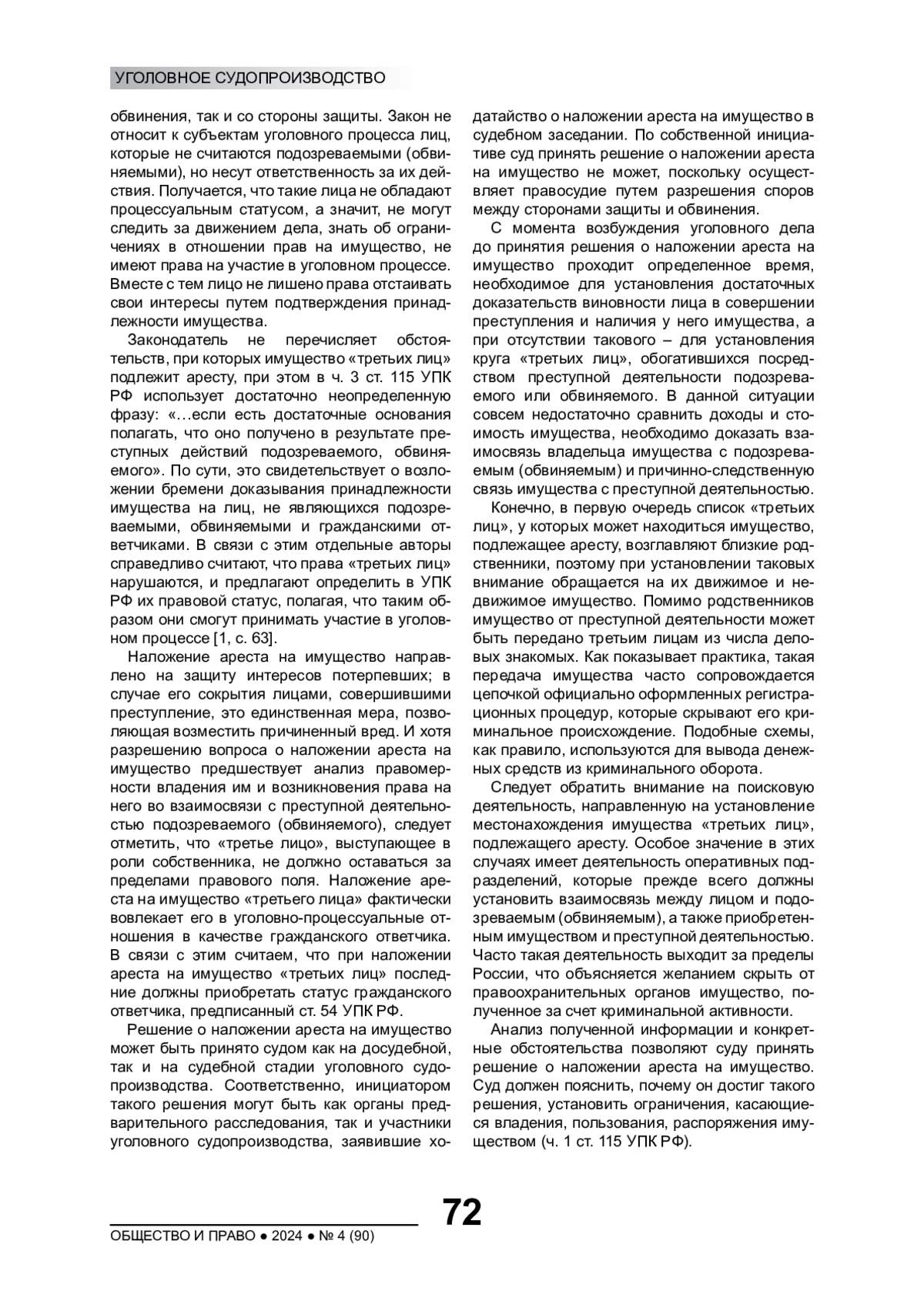 Статья: ОТДЕЛЬНЫЕ ВОПРОСЫ НАЛОЖЕНИЯ АРЕСТА НА ИМУЩЕСТВО В СВЕТЕ ЗАЩИТЫ ПРАВ УЧАСТНИКОВ УГОЛОВНОГО СУДОПРОИЗВОДСТВА (2024)