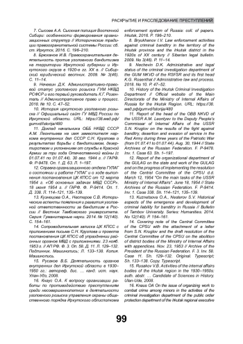 15. Русаков В.Б. Деятельность органов внутренних дел Иркутской области в 1930-1950 гг.: автореф. дис. … канд. ист. наук. Улан-Удэ, 2008. EDN: NKQWBR