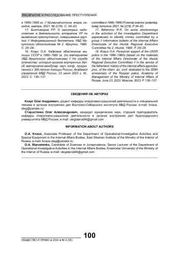 18. Кнаус О.А. Кадровое обеспечение милиции СССР в 1960-1980 гг. (по материалам УВД Иркутского облисполкома) // На службе отечеству: история органов внутренних дел: сб. материалов междунар. науч. конф., приуроченной к 305-летию полиции России, Академия управления МВД России, 23 июня 2023 г. М., 2023. С. 130-137. EDN: IANNCH