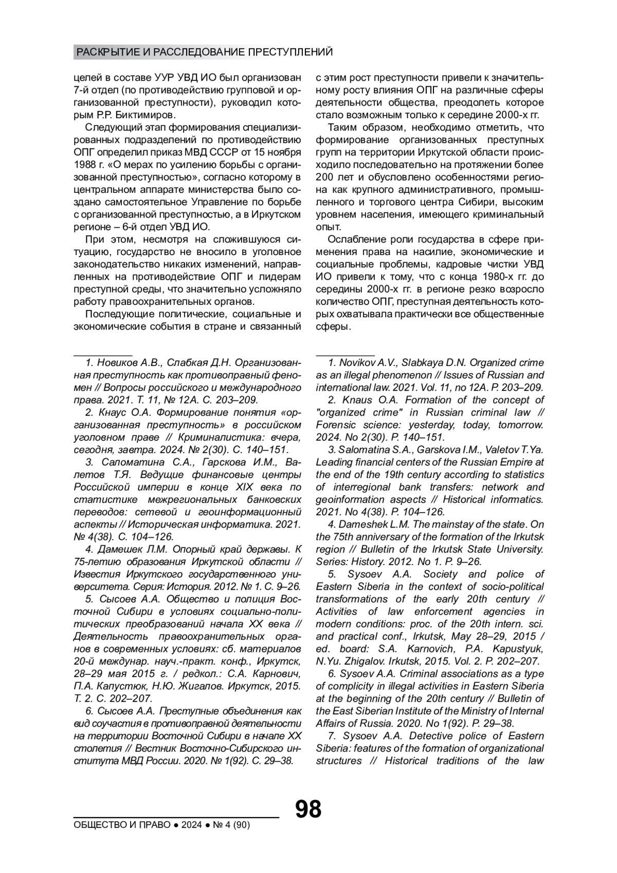 1. Новиков А.В., Слабкая Д.Н. Организованная преступность как противоправный феномен // Вопросы российского и международного права. 2021. Т. 11, № 12A. С. 203-209. EDN: FTBVHQ