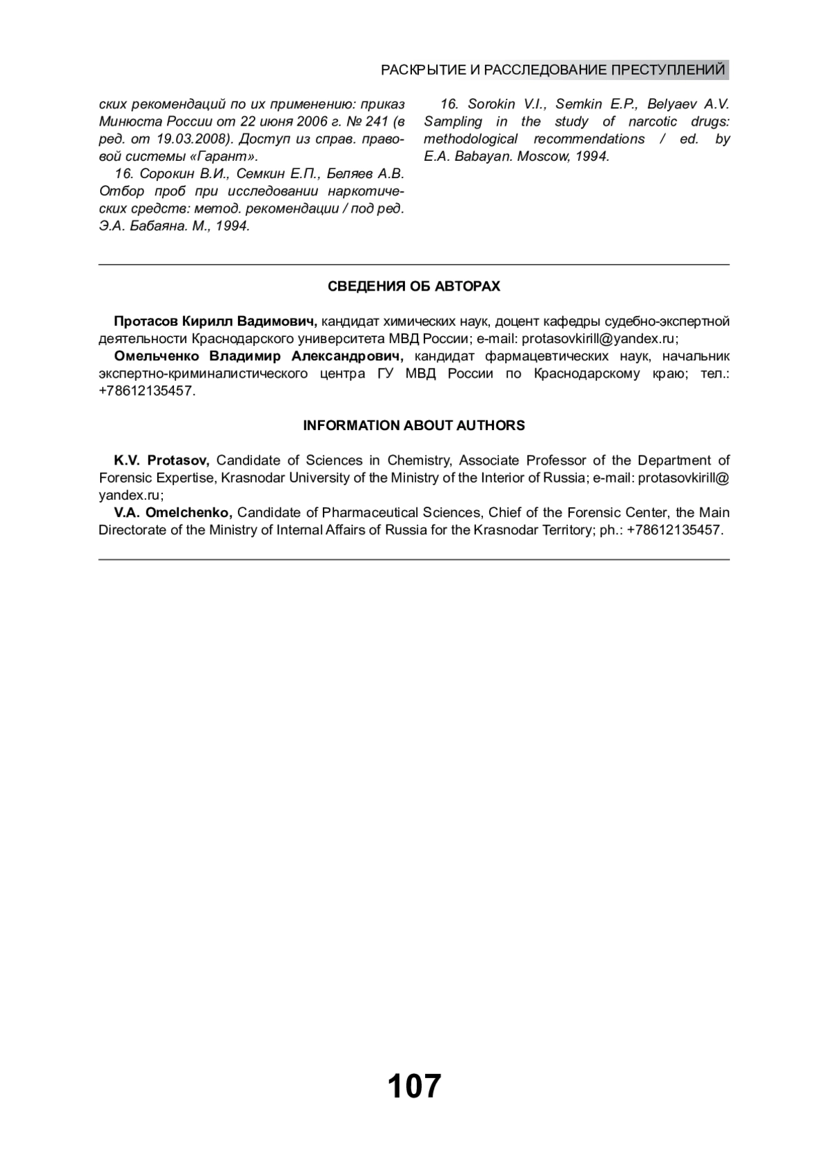 16. Сорокин В.И., Семкин Е.П., Беляев А.В. Отбор проб при исследовании наркотических средств: метод. рекомендации / под ред. Э.А. Бабаяна. М., 1994.