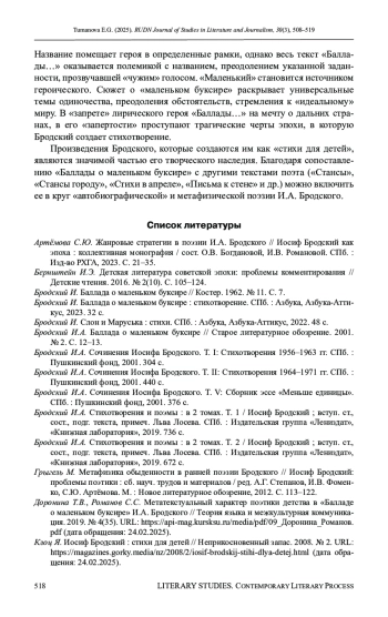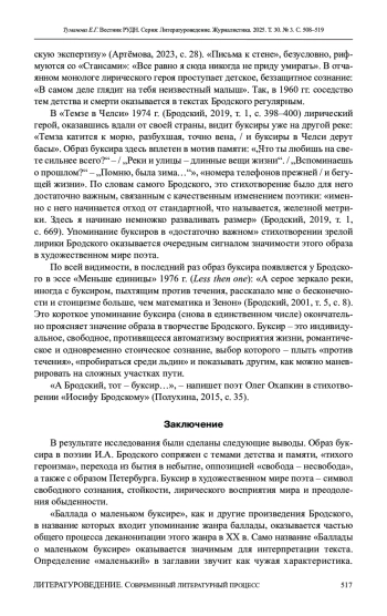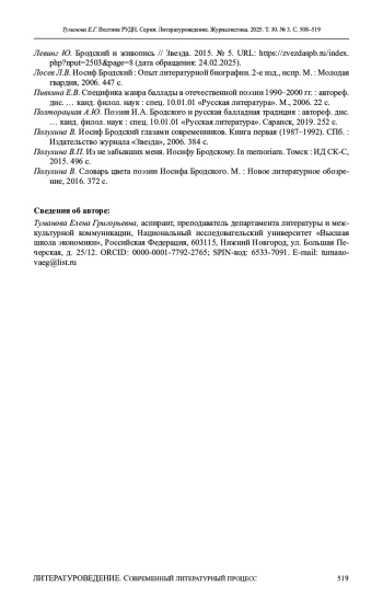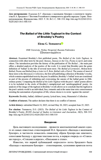 ТУМАНОВА Е. Г. «БАЛЛАДА О МАЛЕНЬКОМ БУКСИРЕ» В КОНТЕКСТЕ ТВОРЧЕСТВА И. А. БРОДСКОГО // ВЕСТНИК РОССИЙСКОГО УНИВЕРСИТЕТА ДРУЖБЫ НАРОДОВ. СЕРИЯ: ЛИТЕРАТУРОВЕДЕНИЕ. ЖУРНАЛИСТИКА. 2025. ТОМ 30 № 3