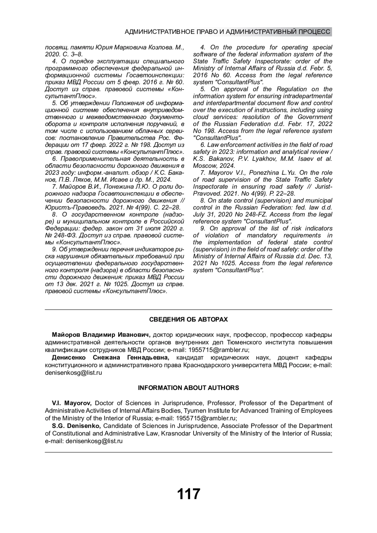 7. Майоров В.И., Понежина Л.Ю. О роли дорожного надзора Госавтоинспекции в обеспечении безопасности дорожного движения // Юристъ-Правоведъ. 2021. № 4(99). С. 22-28. EDN: FOEGNK