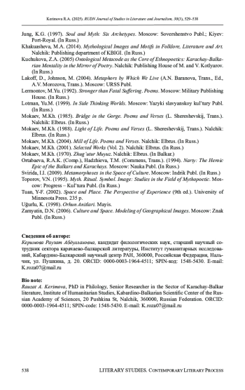 4. Кучукова З.А. Онтологический метакод как ядро этнопоэтики: карачаево-балкарская ментальность в зеркале поэзии. Нальчик: Изд-во М. и В. Котляровых, 2005. 309 с. EDN: QSJRUT