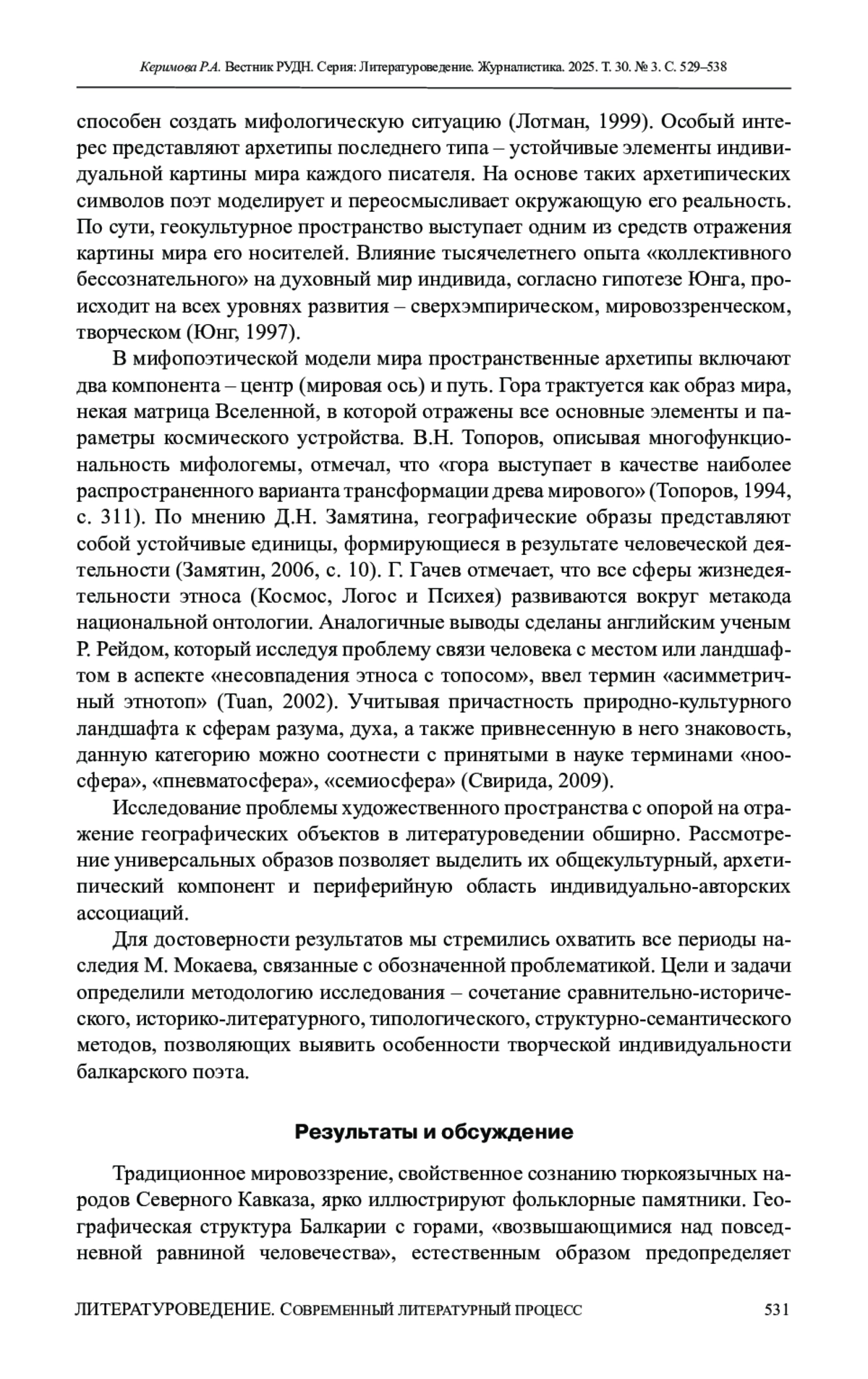 Рассматриваются образные реализации одного из ключевых архетипов в поэтике М. Мокаева. Гора как форма материального мира являет собой архетип «верха», символизирует силу, связь с божественным началом. Путь духовного просветления сопряжен с мотивом преодоления трудностей и испытаний. Мифологические номинации выступают носителями ценностных ориентиров, соотносятся с мотивом вдохновения и творческого роста. В поэзии балкарского писателя наблюдается новая информация о символе, представленная в виде авторских ассоциаций, восходящих к прецедентным текстам. Доказывается, что художественная система М. Мокаева на глубинном уровне тесно связана с архаическими представлениями народа, культурно-историческим хронотопом. Соотнесенность пространственной семантики с мифологическим кодом обнаруживается в поэтическом тексте посредством локативных антитез (профанное/сакральное, свое/чужое). В результате выявлено, что архетипический символ «гора», с одной стороны, - это фрагмент индивидуальной картины мира, а с другой - он взаимодействует с универсальными для мировой литературы категориями и ценностными ориентациями. Мифологема горы - это не только отсылка к мифу как к тексту, но и к мифу как жанру, что создает предпосылку к мифологической ситуации («жизнь - восхождение»). Изучение идиостиля поэта сквозь призму понятия «архетип как мыслеформа» (по Ю. Лотману) позволяет глубже проникнуть в авторский замысел, целостно представить художественно-эстетическую систему писателя.