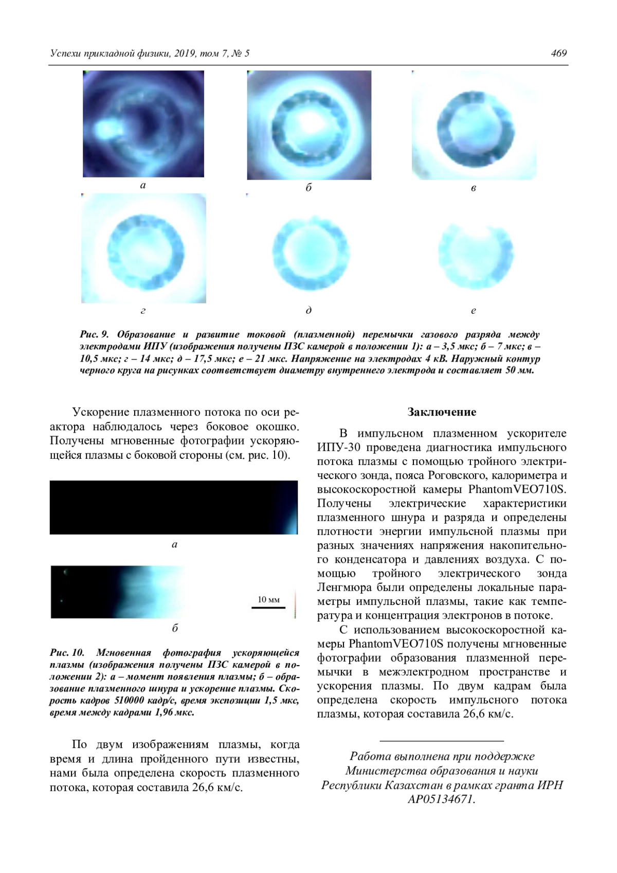 С использованием высокоскоростной камеры PhantomVEO710S получены мгновенные фотографии образования плазменной перемычки в межэлектродном пространстве и ускорения плазмы. По двум кадрам была определена скорость импульсного потока плазмы, которая составила 26,6 км/с.