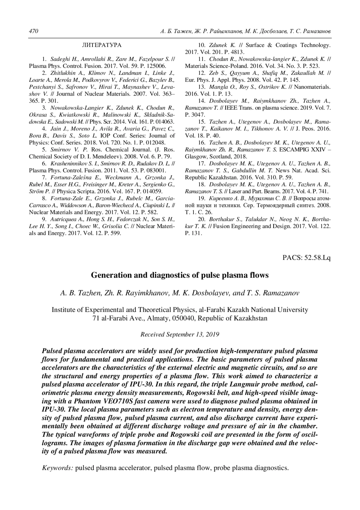 18. Dosbolayev M. K., Utegenov A. U., Tazhen A. B., Ramazanov T. S. // Laser and Part. Beams. 2017. Vol. 4. P. 741.