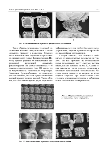 Методами растровой электронной микроскопии проведены исследования матриц фоточувствительных элементов и мультиплексоров, используемых для изготовления инфракрасных матричных фотоприемных устройств, после нанесения на них индиевых микроконтактов. Контакты формировались двумя различными способами: классическим и экспериментальным (с одним «взрывом»). Исследования позволили выявить различные типы дефектов и причины их возникновения. Проведено сравнение двух способов изготовления микроконтактов с целью определения оптимального для повышения процента выхода годных фотоприемных устройств.