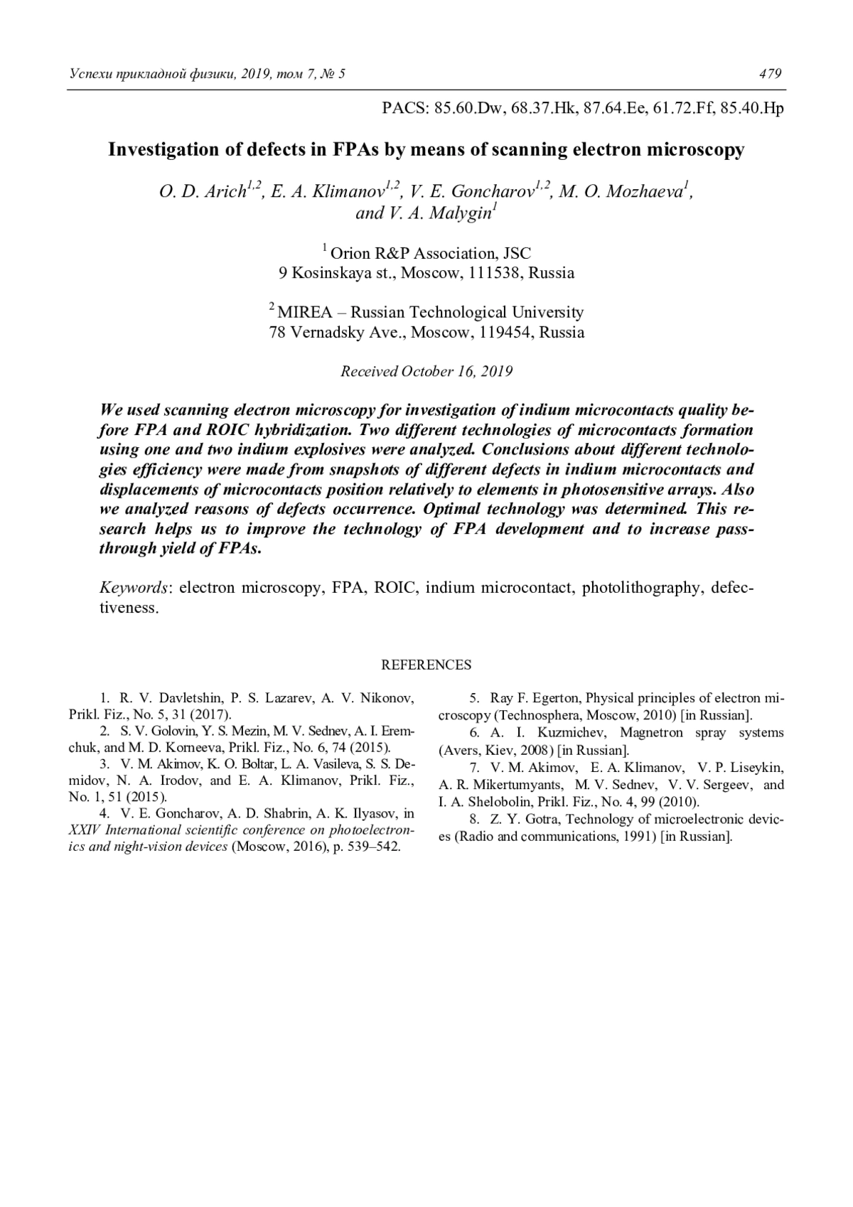АРИЧ О. Д., КЛИМАНОВ Е. А., ГОНЧАРОВ В. Е., МОЖАЕВА М. О., МАЛЫГИН В. А. ИССЛЕДОВАНИЕ ДЕФЕКТОВ МАТРИЧНЫХ ФОТОПРИЕМНЫХ УСТРОЙСТВ МЕТОДАМИ ЭЛЕКТРОННОЙ МИКРОСКОПИИ // УСПЕХИ ПРИКЛАДНОЙ ФИЗИКИ. 2019. ТОМ 7, №5