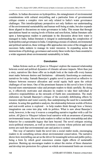This study explores the role of Indian literature in addressing socio-political and environmental issues with a primary case study of Sarnath Banerjee’s graphic novel All Quiet in Vikaspuri and investigates how the novel employs narrative fiction to expose not only several interlocking factors contributing to water scarcity and destruction of habitat but also an array of political projections. This novel is deeply questioning the critical issues of population control, environmental justice and economic restructuring. Employing qualitative literary analysis, the research delves into how the novel critiques socio-political structures and underscores the need for urgent changes to prevent further environmental degradation and human suffering. The findings reveal Banerjee’s novel urges readers to reflect on their role in the environment, far beyond mere entertainment. The novel disrupts global paradigms, questions established sociopolitical ideas and proposes a new horizon for life on Earth with full responsibility in respecting our environmental boundaries while pursuing social justice. The study finds that texts such as All Quiet in Vikaspuri are important environmental education and advocacy tools inspiring readers to imagine and implement a sustainable society. This research urges for a more inclusive understanding and enactment of sustainable solutions across all the ecologic-social nexus.