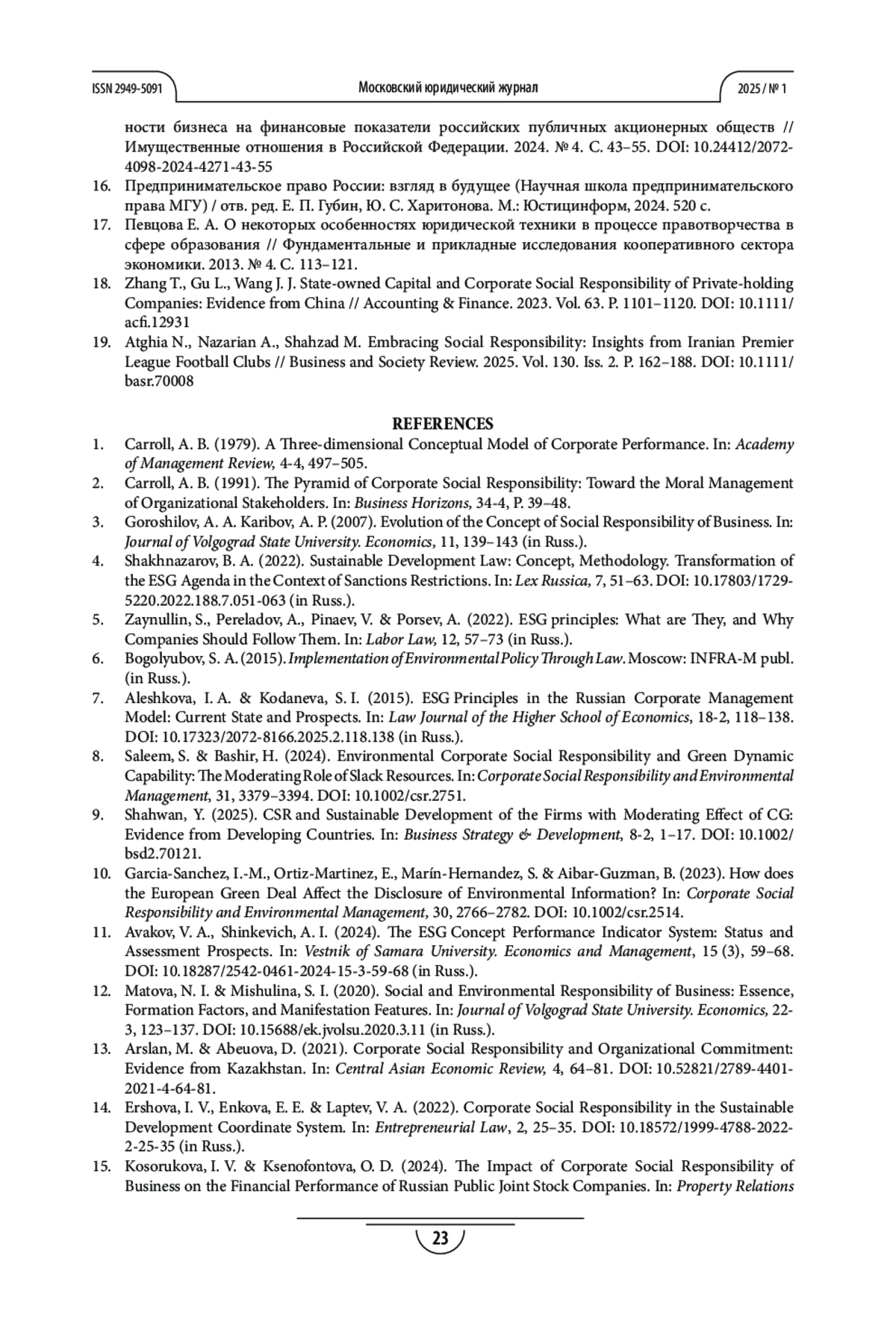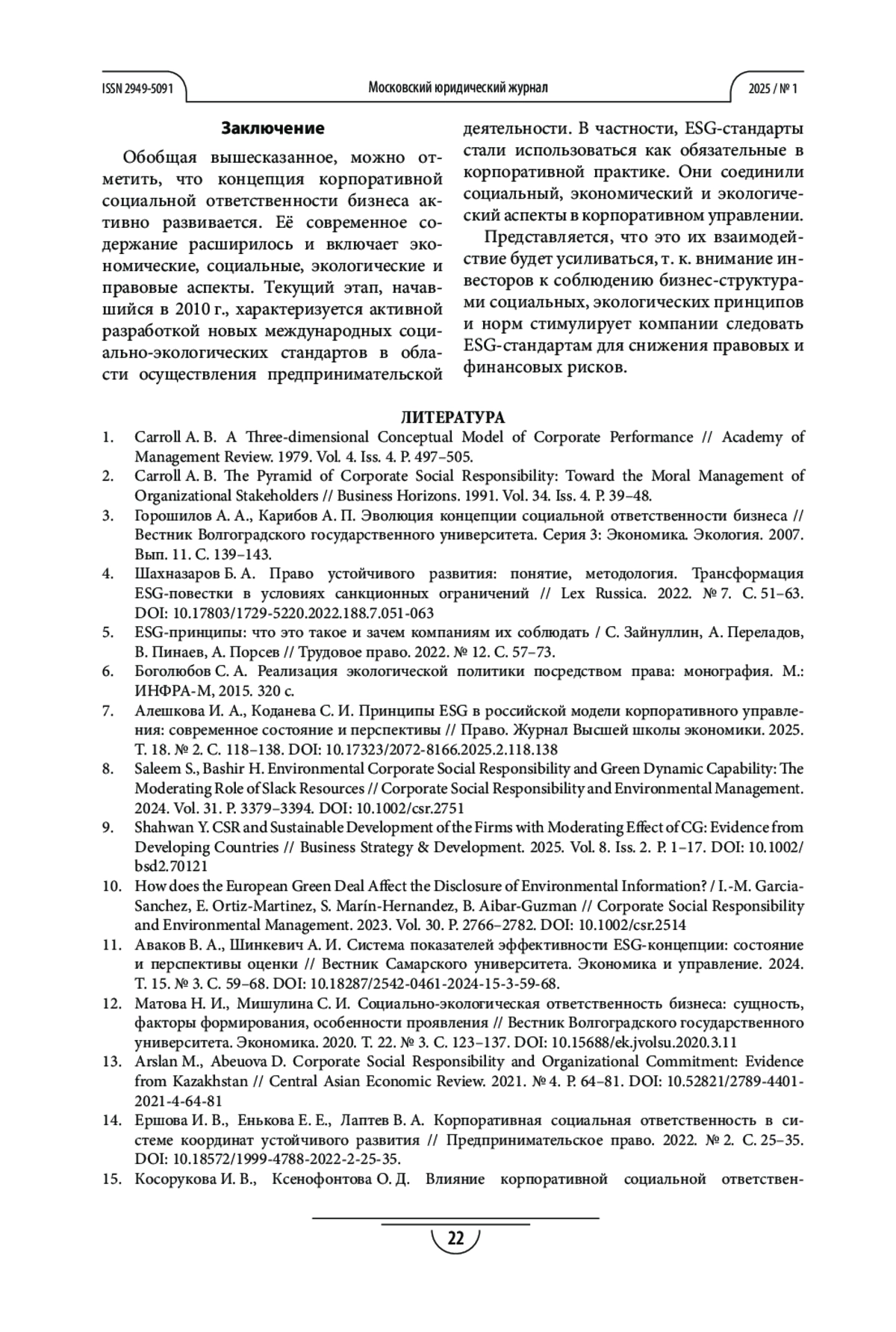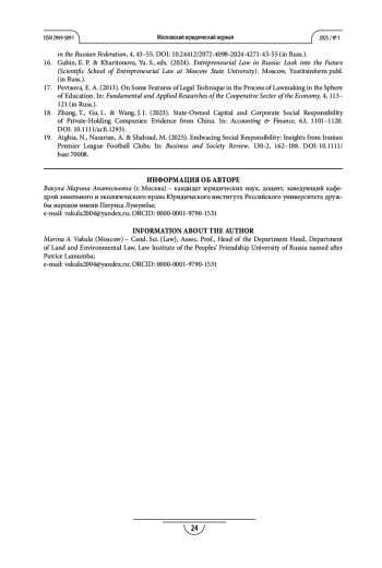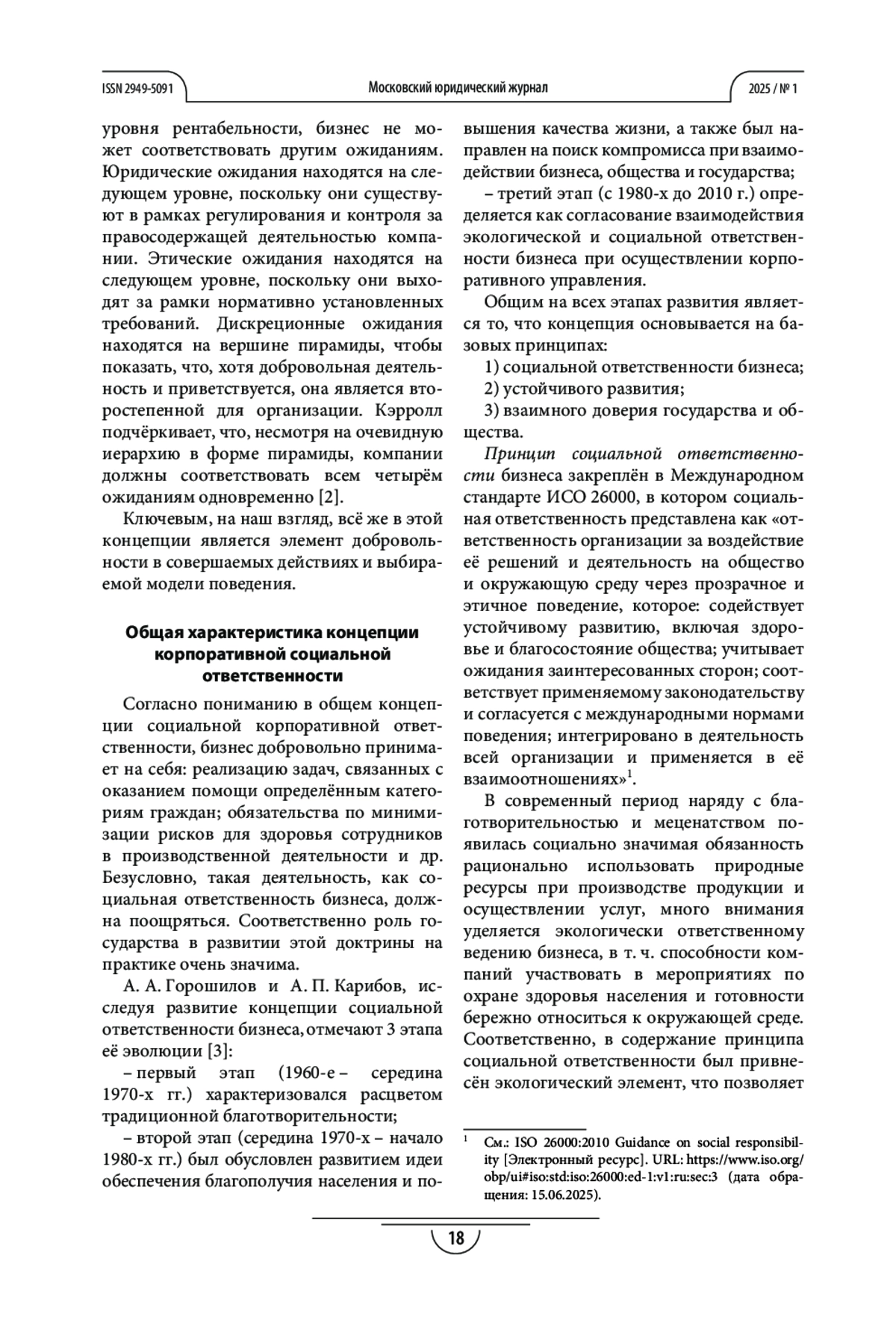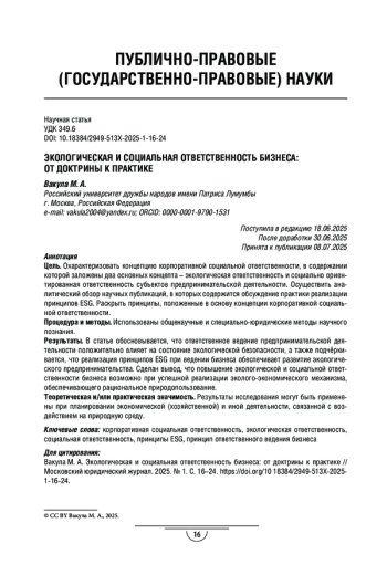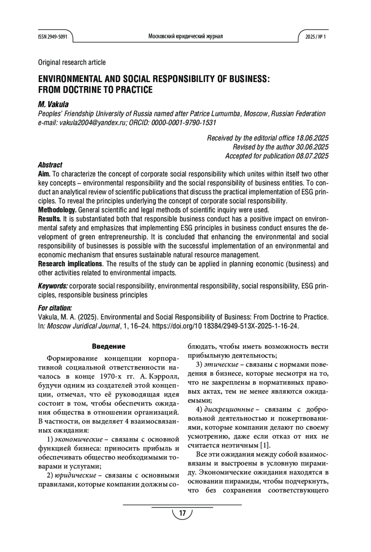 ВАКУЛА М. А. ЭКОЛОГИЧЕСКАЯ И СОЦИАЛЬНАЯ ОТВЕТСТВЕННОСТЬ БИЗНЕСА: ОТ ДОКТРИНЫ К ПРАКТИКЕ // МОСКОВСКИЙ ЮРИДИЧЕСКИЙ ЖУРНАЛ. 2025. 2025 / №1