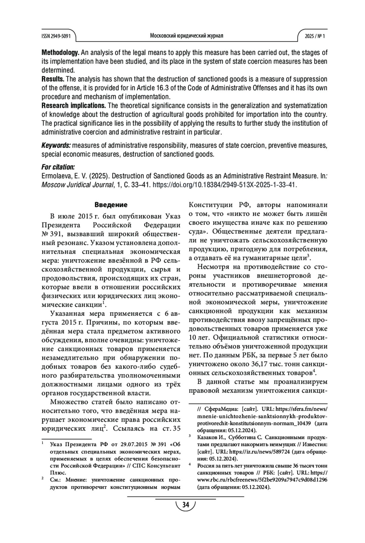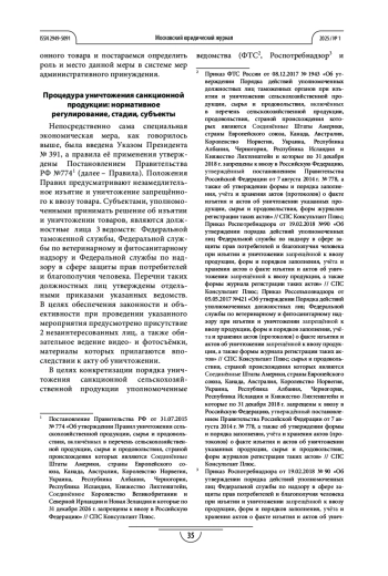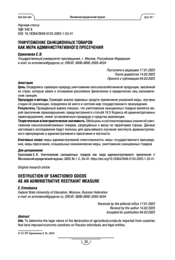 Цель. Определить правовую природу уничтожения сельскохозяйственной продукции, ввезённой из стран, которые ввели в отношении российских физических и юридических лиц экономические санкции.