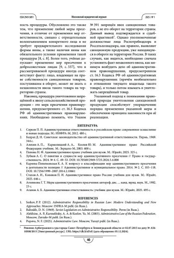 Результаты. Проведённый анализ показал, что уничтожение санкционных товаров является мерой пресечения правонарушения, предусмотренного статьёй 16.3 Кодекса об административных правонарушениях, имеет установленную процедуру и средства реализации.