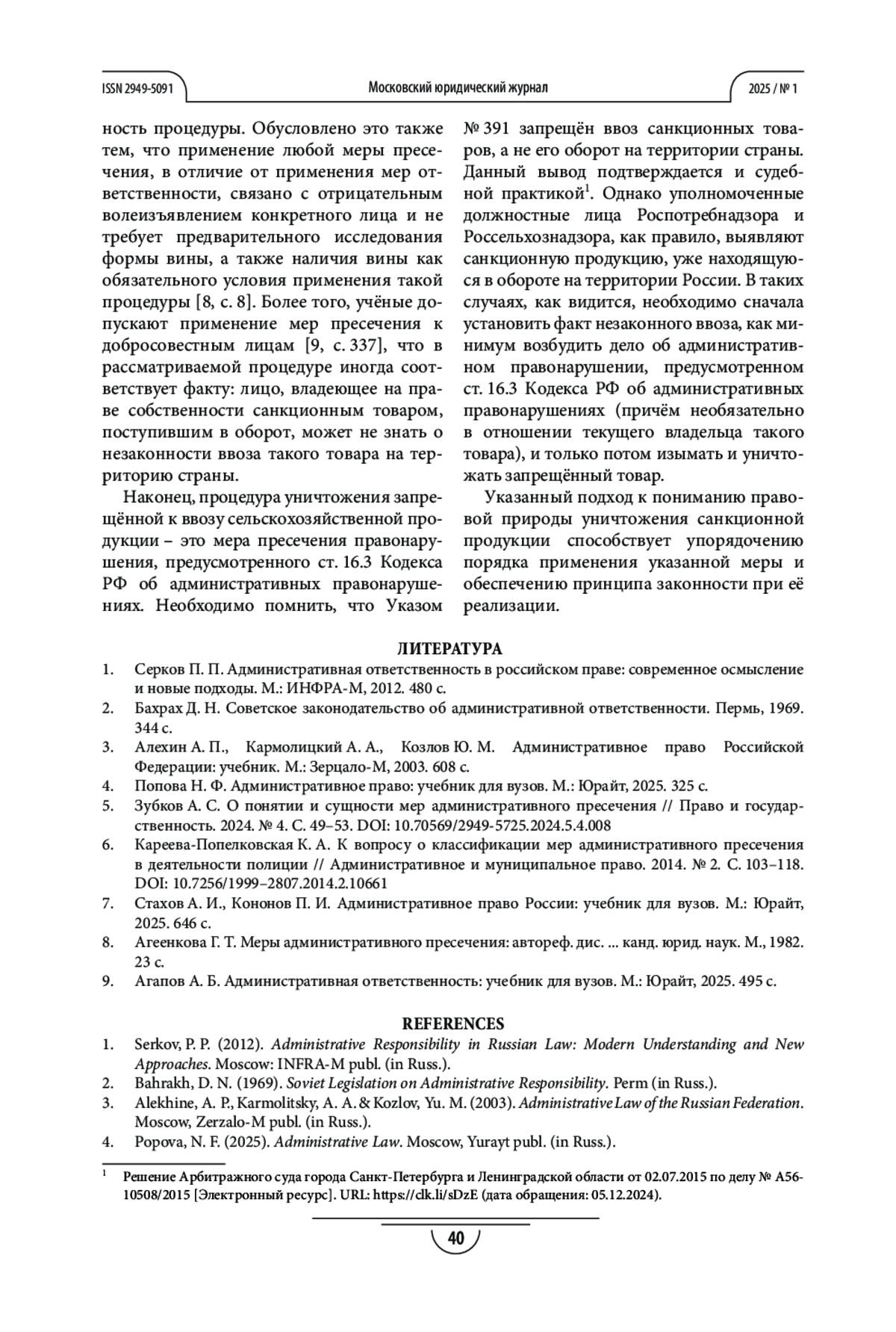 5. Зубков А. С. О понятии и сущности мер административного пресечения // Право и государственность. 2024. № 4. С. 49-53. https://doi.org/10.70569/2949-5725.2024.5.4.008