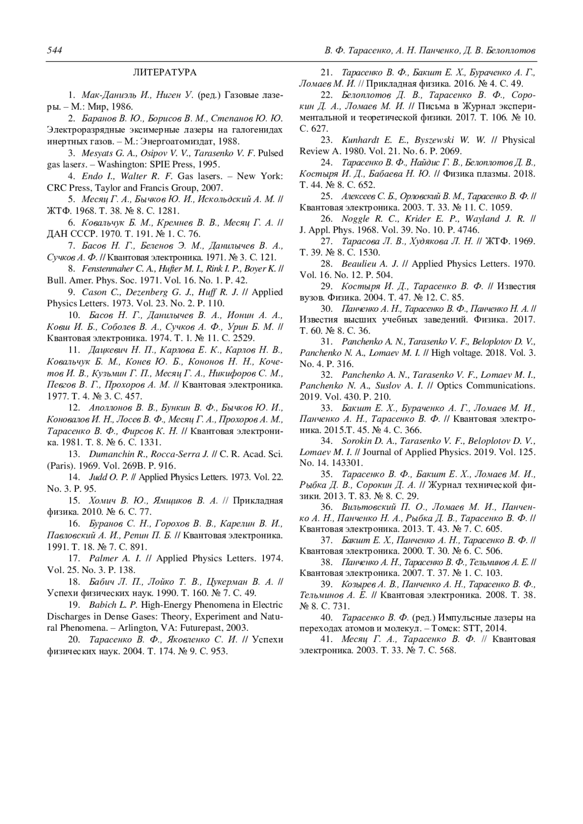 37. Бакшт Е. Х., Панченко А. Н., Тарасенко В. Ф. // Квантовая электроника. 2000. Т. 30. № 6. С. 506.