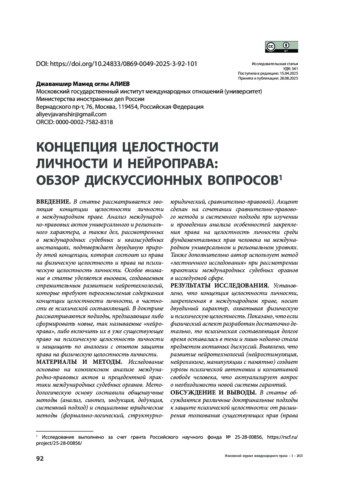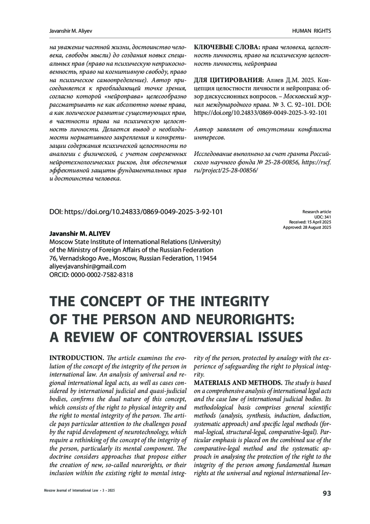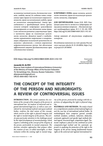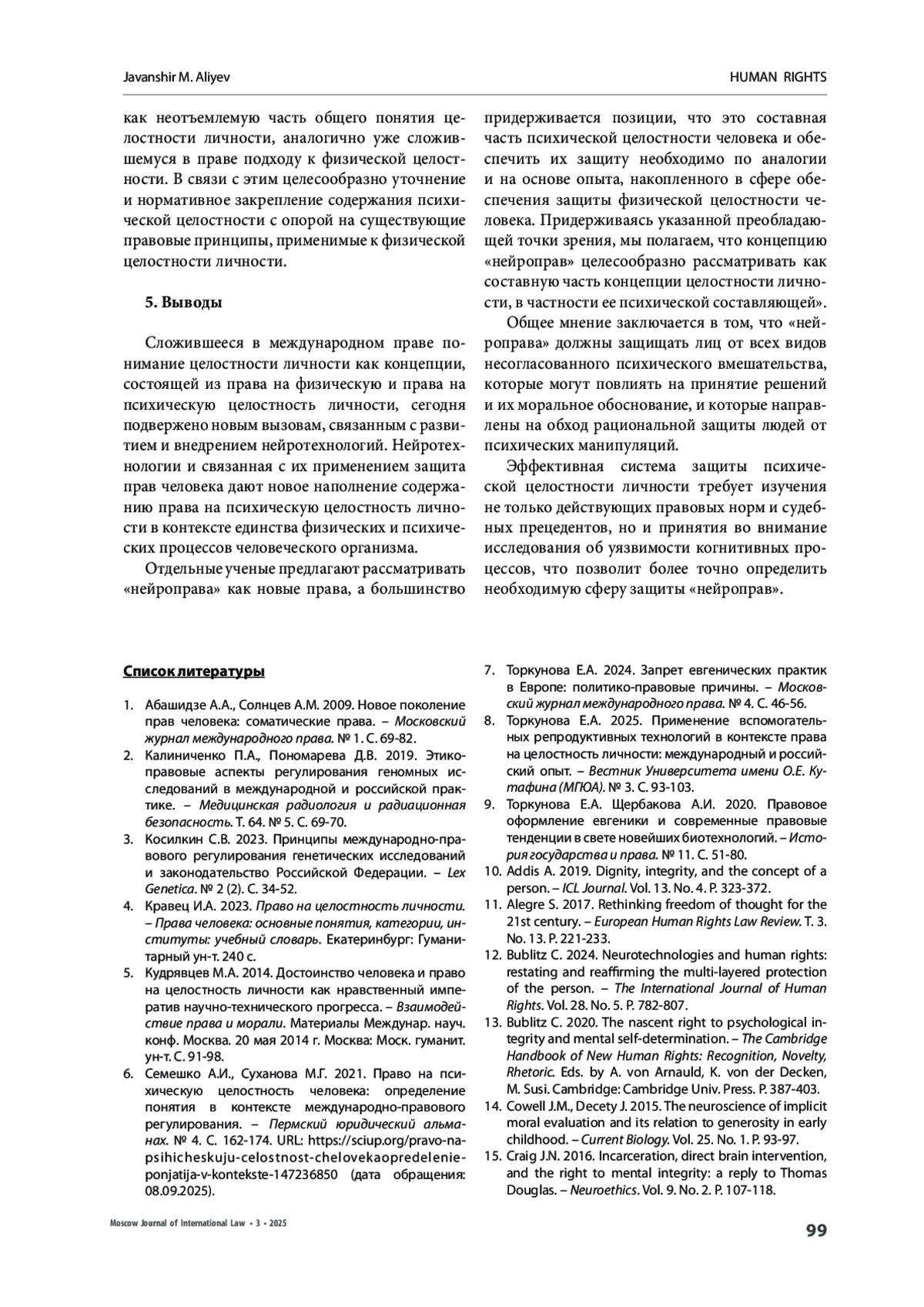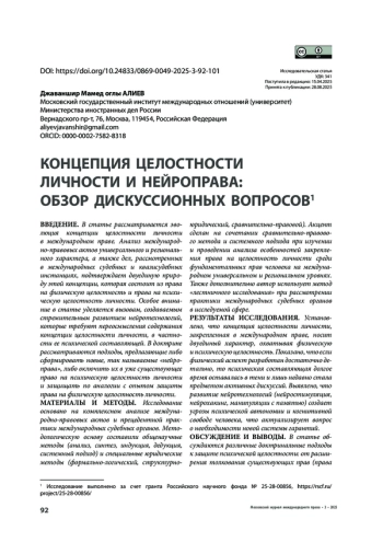 АЛИЕВ Д. М. КОНЦЕПЦИЯ ЦЕЛОСТНОСТИ ЛИЧНОСТИ И НЕЙРОПРАВА: ОБЗОР ДИСКУССИОННЫХ ВОПРОСОВ // МОСКОВСКИЙ ЖУРНАЛ МЕЖДУНАРОДНОГО ПРАВА. 2025. ВЫПУСК 3