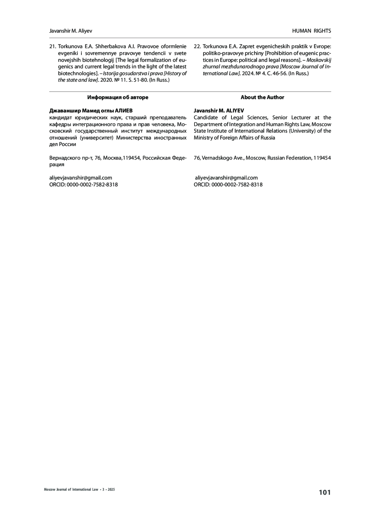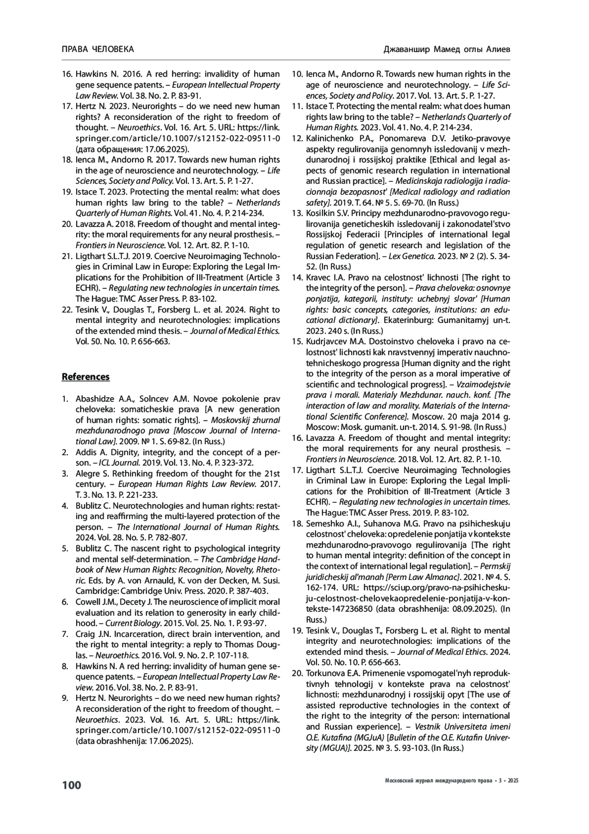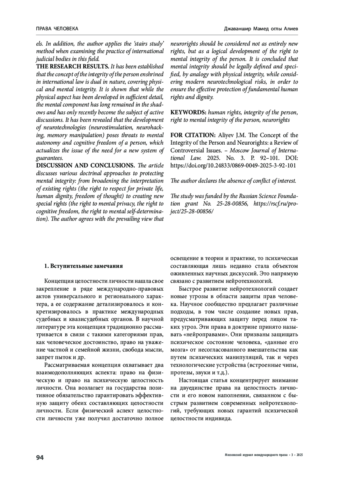 АЛИЕВ Д. М. КОНЦЕПЦИЯ ЦЕЛОСТНОСТИ ЛИЧНОСТИ И НЕЙРОПРАВА: ОБЗОР ДИСКУССИОННЫХ ВОПРОСОВ // МОСКОВСКИЙ ЖУРНАЛ МЕЖДУНАРОДНОГО ПРАВА. 2025. ВЫПУСК 3